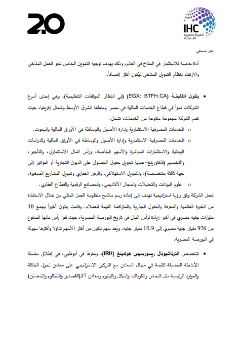 - بلتون القابضة (EGX BTFH.CA) في انتظار الموافقات التنظيمية)، وهي إحدى أسرع الشركات نمواً في قطاع الخدمات المالية في مصر ومنطقة الشرق الأوسط وشمال إفريقيا، حيث تقدم الشركة مجموعة متنوعة من الخدمات، تشمل: الخدمات المصرفية الاستثمارية وإدارة الأصول والوساطة في الأوراق المالية والبحوث. ه الخدمات المصرفية الاستثمارية وإدارة الأصول والوساطة في الأوراق المالية والدراسات البحثية والاستثمارات المباشرة والأسهم الخاصة، ورأس المال الاستثماري، والتأجير والتخصيم (فاكتورينغ – عملية تحويل حقوق الحصول على الديون التجارية أو الفواتير إلى جهة ثالثة متخصصة، والتمويل الاستهلاكي، والرهن العقاري وتمويل المشاريع الصغيرة. ه علوم البيانات والتحليلات والمجال الأكاديمي، والمصانع الرقمية والقطاع العقاري.