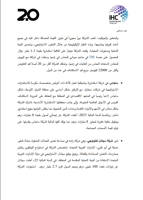- انترناشيونال ريسورسيس هولدينغ (IRH)، ومقرها في أبوظبي، تعمل في مجال إطلاق سلسلة الأنشطة المضيفة للقيمة في مجال المعادن مع التركيز الاستراتيجي على معادن تحول الطاقة والموارد الرئيسية مثل النحاس والكوبالت والنيكل والليثيوم ومعادن 37 القصدير والتنتالوم والتنغستن والمنغنيز والجرافيت تلعب الشركة دوراً محورياً في تعزيز القيمة المضافة داخل البلد في جميع أنحاء إفريقيا وخارجها، وبناء النظم الإيكولوجية من خلال التعاون الاستراتيجي، وتحسين البنية التحتية ومستويات المعيشة. وقعت الشركة مؤخراً على اتفاقية استثمارية بقيمة 1.1 مليار دولار للحصول على حصة %51% في مناجم موبائي للنحاس في زامبيا ودخلت في شراكة مع اليوبيل للمعادن لاستعادة النحاس من النفايات في زامبيا. وتمتلك الشركة أكثر من 20 أصلا قيد التفاوض وأكثر من 22000 كيلومتر مربع قيد الاستكشاف في عدد من الدول.