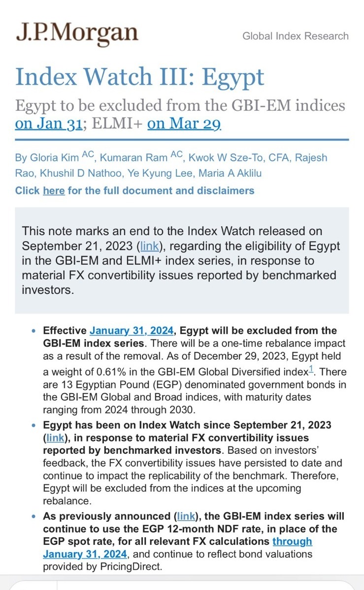 وقال جيه.بي مورجان في بيان نقلته وكالة رويترز للأنباء إن مصر خاضعة لمراقبة المؤشر منذ 21 سبتمبر 2023 على خلفية مشكلات تتعلق بقابلية تحويل النقد الأجنبية الجوهرية التي أبلغ عنها مستثمرون يتم الرجوع إليهم.