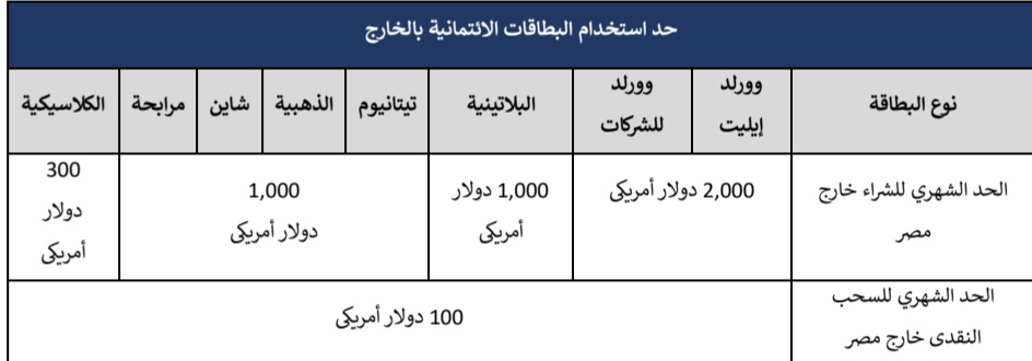 وأضاف أن الحد الشهري للشراء خارج مصر هو 2000 دولار للبطاقات الإئتمانية(وورلد ايليت-وورلد للشركات) فيما يبلغ 1000 دولار للبطاقة البلاتينية.