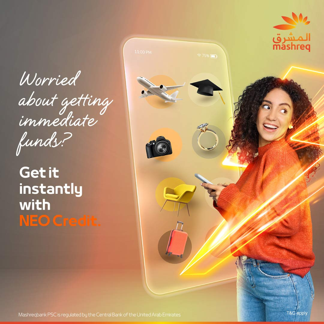 وكشفت أبحاث العملاء التي أجراها المشرق عن أن بعض العملاء يحتاجون أحياناً إلى الحصول على تمويل بشكل عاجل. ولهذا قام البنك بتطوير عملية سهلة وسريعة لمساعدة هؤلاء العملاء في الحصول على قروض فورية باستخدام «NEO Credit».