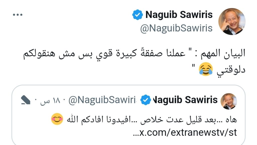 وكتب ساويرس تعليقا على خبر بشأن “ترقب صدور بيان مهم عن مجلس الوزراء”، قائلا على صفحته عبر منصة “إكس”، تويتر سابقا: ” البيان المهم: “عملنا صفقةً كبيرة قوي بس مش هنقولكم دلوقتي””.