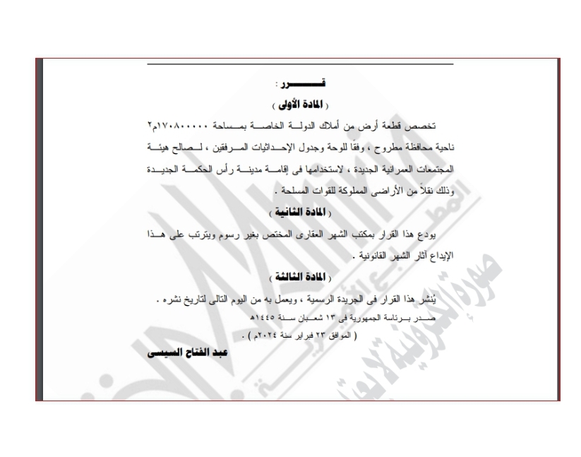 تخصص قطعة أرض من أملاك الدولة الخاصة بمساحة ۱۷۰۸۰۰۰۰۰م۲ ناحية محافظة مطروح ، وفقا للوحة وجدول الإحداثيات المرفقين ، لصالح هيئة المجتمعات العمرانية الجديدة ، لاستخدامها في إقامة مدينة رأس الحكمة الجديدة