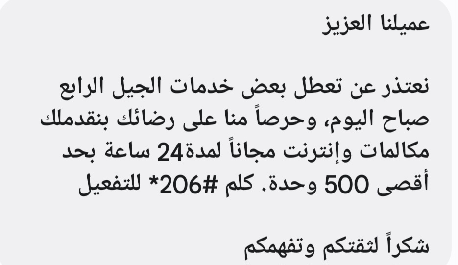 وفي رسالة نصية بعثت بها الشركة لعملاءها، أعلنت الشركة اعتذارها للعملاء وأنها ستقدم لهم باقات مكالمات وإنترنت مجانية لمدة 24 ساعة.