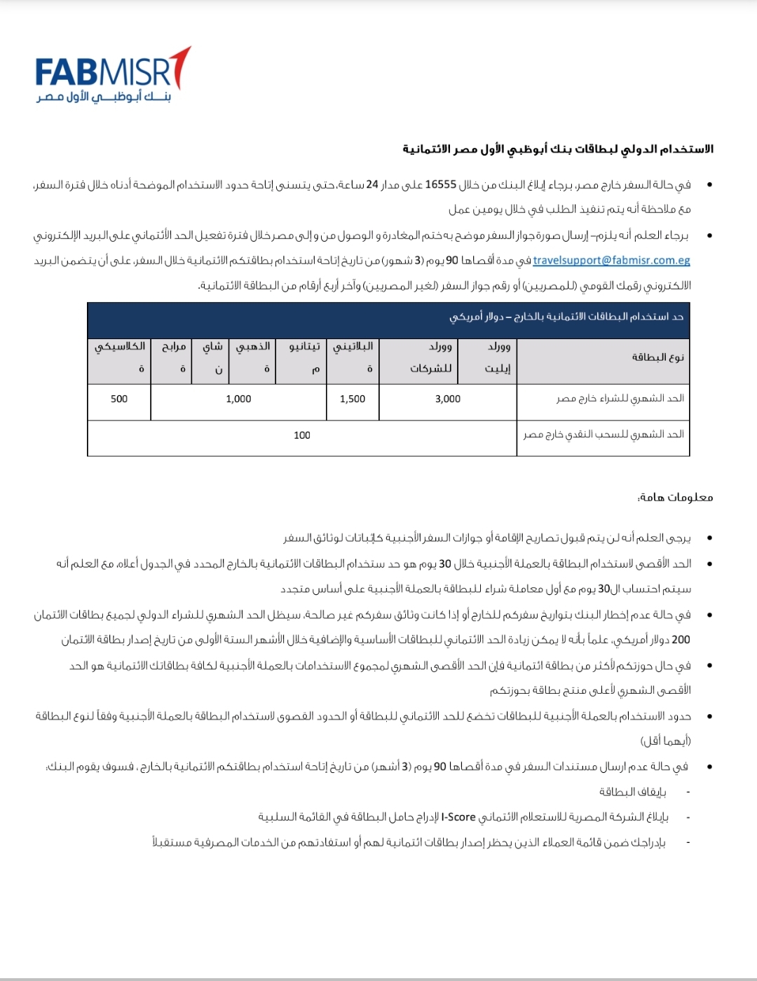 أعلن بنك أبوظبي الأول مصر أنه تم زيادة حدود الإنفاق الدولية لبطاقات الائتمان بالعملات الأجنبية خارج مصر اعتباراً من اليوم 17 مارس 202.