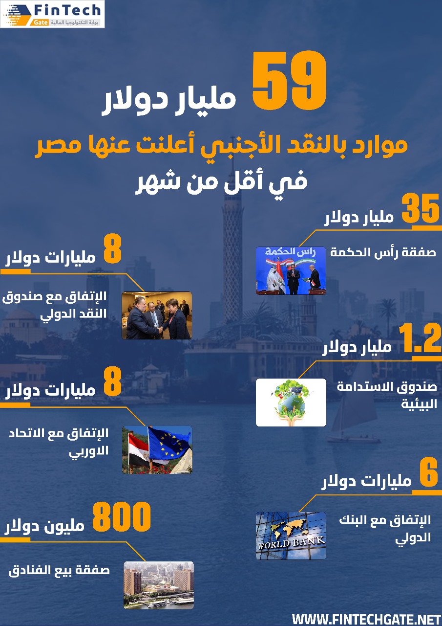 نجحت مصر خلال الفترة الماضية في التوصل إلى إتفاقات دولية وإقليمية إستثمارية وتمويلية بقيمة إجمالية بلغت نحو 59 مليار دولار، شملت إتفاق تطوير وتنمية منطقة رأس الحكمة بجانب إتفاقات عقدتها مع المنظمات وجهات دولية بينها صندوق النقد الدولي والبنك الدولي.