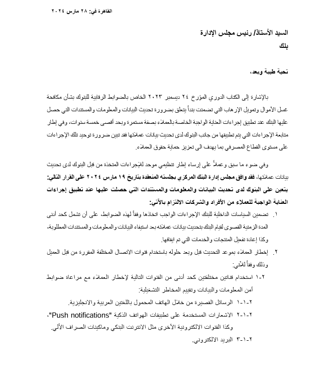 وأضاف أن هذا يأتي في إطار متابعة الإجراءات التي يتم تطبيقها من جانب البنوك لدى تحديث بيانات عملائها فقد تبين ضرورة توحيد تلك الإجراءات على مستوى القطاع المصرفي بما يهدف إلى تعزيز حماية حقوق العملاء.