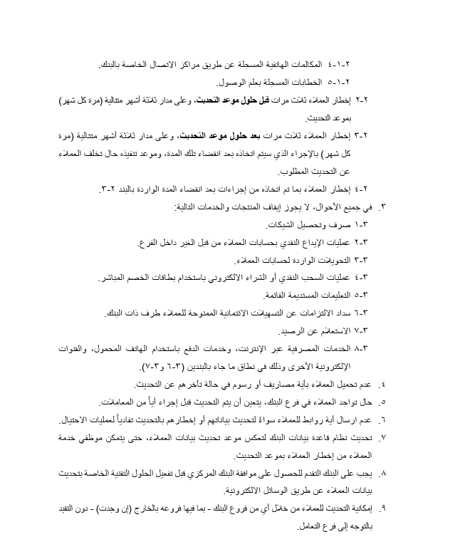 وشددت التعليمات على إخطار العملاء ثلاث مرات بعد حلول موعد التحديث، وعلى مدار ثلاثة أشهر متتالية (مرة كل شهر) بالإجراء الذي سيتم اتخاذه بعد انقضاء تلك المدة، وموعد تنفيذه حال تخلف العملاء عن التحديث المطلوب، وإخطار العملاء بما تم اتخاذه من إجراءات بعد انقضاء المدة.