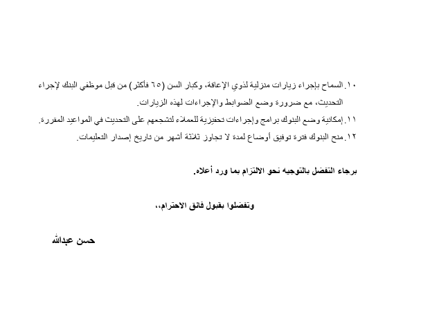 وشملت التعليمات، ضرورة تضمين السياسات الداخلية للبنك الإجراءات الواجب اتخاذها وفقاً لهذه الضوابط على أن تشمل كحد أدنى المدة الزمنية القصوى لقيام البنك بتحديث بيانات عملائه بعد استيفاء البيانات والمعلومات والمستندات المطلوبة وكذا إعادة تفعيل المنتجات والخدمات التي تم ايقافها.