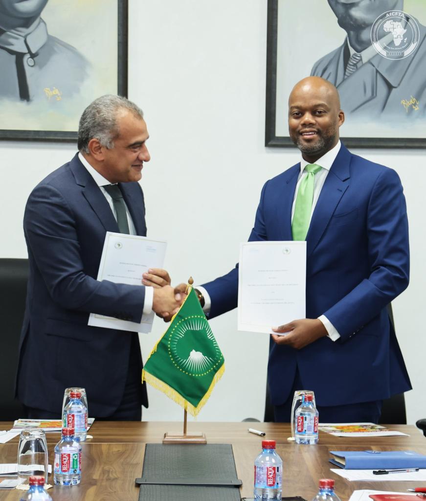 تم توقيع مذكرة التفاهم من قبل الأمين العام لمنطقة التجارة الحرة القارية الأفريقية، سعادة السيد وامكيلي ميني، والسيد كريم رفعت، رئيس مجلس إدارة شركة انجيج كونسلتينج للإستشارات والدكتور شريف فهمي، الرئيس التنفيذي.