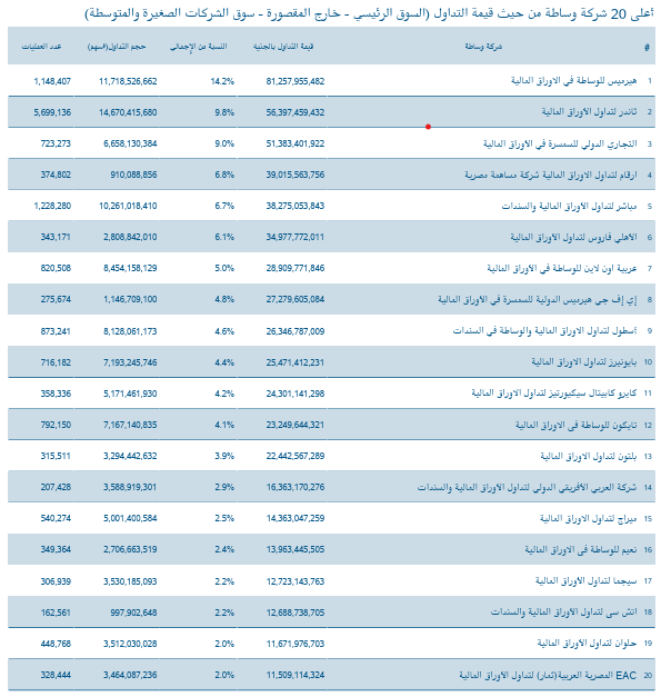 وجاءت «إي إف جي هيرميس الدولية للسمسرة في الأوراق المالية» فى المركز الثامن بقيمة 27.279 مليار جنيه وحجم 1.146 مليار ورقة مستحوذة 4.8% بعدد عمليات بلغ 275.674 ألف عملية، ثم «اسطول لتداول الأوراق المالية والوساطة في السندات» في المركز التاسع بقيمة تعاملات 26.346 مليار جنيه مستحوذة على 4.6% من التداولات وحجم تعاملات 8.128 مليار ورقة بعدد عمليات 873.241 ألف عملية.