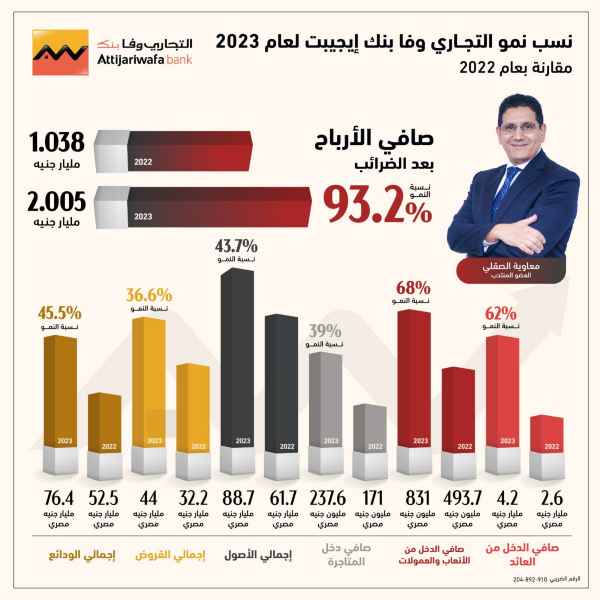 حقق بنك التجاري وفا بنك إيجيبت نتائج أعمال قياسية خلال العام الماضي 2023، محققا نموا بلغت نسبته 93.2% في صافي الربح لتصل إلى 2.005 مليار جنيه، مقارنة مع 1.038 مليار جنيه في 2022 بزيادة قدرها 967 مليون جنيه.