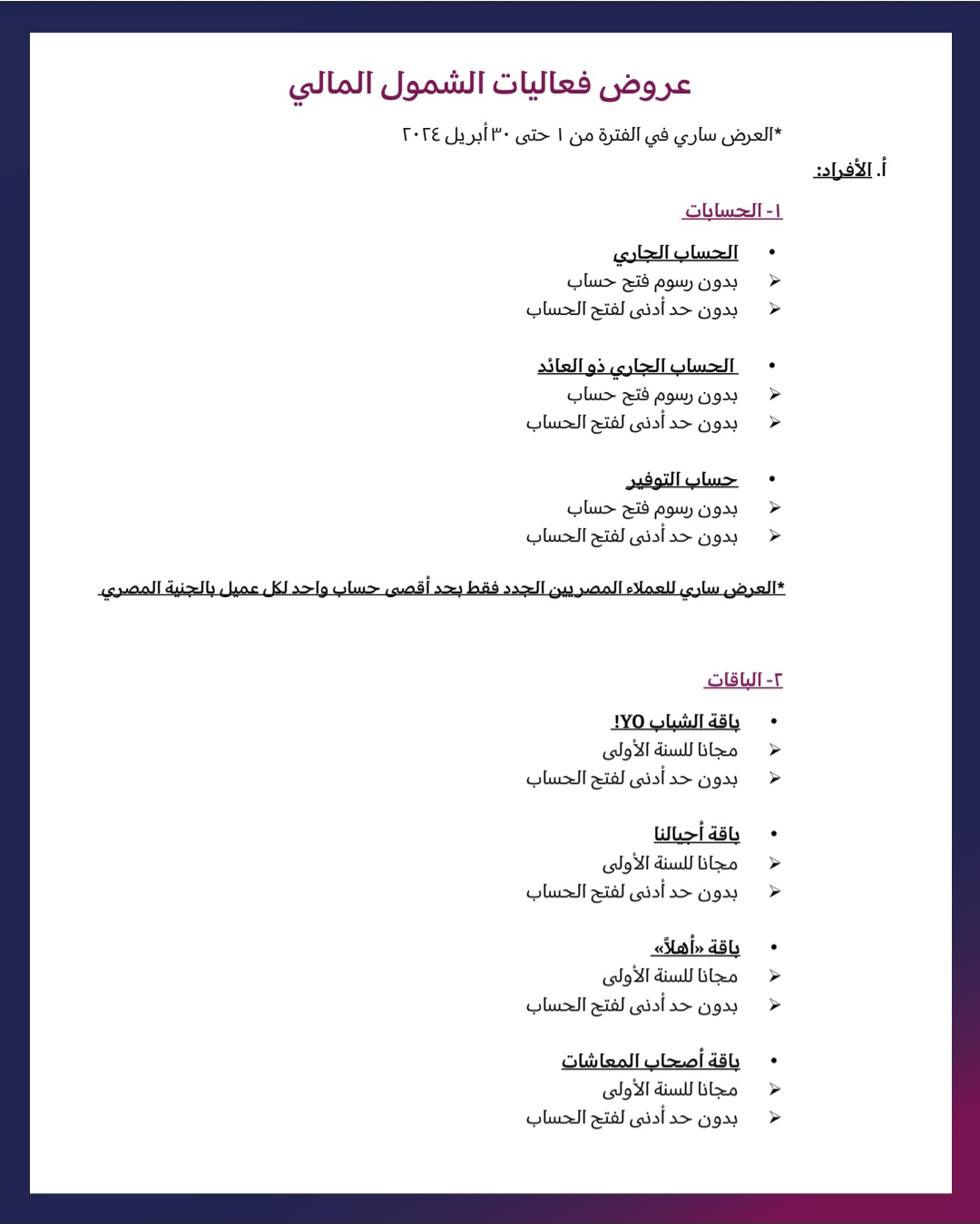 وأوضح أن باقات( الشباب YO- أجيالنا-اهلا-أصحاب المعاشات) فإن فتح الحساب مجانا للسنة الأولى وبدون حد أدنى لفتح الحساب.