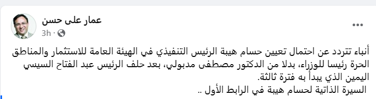 وقال الدكتور عمار على صفحته على الفيسبوك أن تعيين حسام هيبة رئيسا لوزراء مصر سيكون بعد حلف الرئيس عبد الفتاح السيسي اليمين الدستورية لبداية ولاية رئاسة ثالثة.