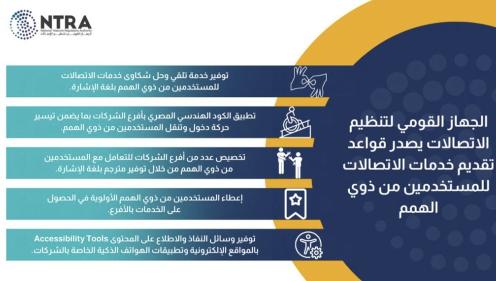 وتتضمن قواعد تقديم خدمات الاتصالات للمستخدمين من ذوي الهمم، التزام الشركات المرخص لها بتوفير خدمة تلقي وحل الشكاوى بلغة الإشارة، والتي يمكن من خلالها وباستخدام تقنيات وتطبيقات إجراء مكالمات الفيديو تلقي الشكاوى والعمل على حلها، وإتاحة باقات بأسعار مخفضة ومناسبة.