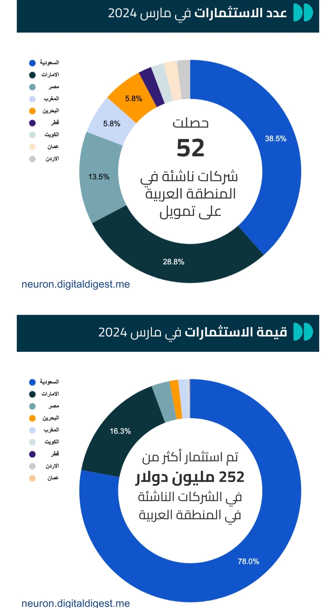 وجاءت هذه التمويلات من خلال 52 شركة استحوذت السعودية على 38.5% منها ثم الإمارات 28.8% ثم مصر 13.5% تحتها المغرب 5.8% ثم البحرين بذات النسبة.
