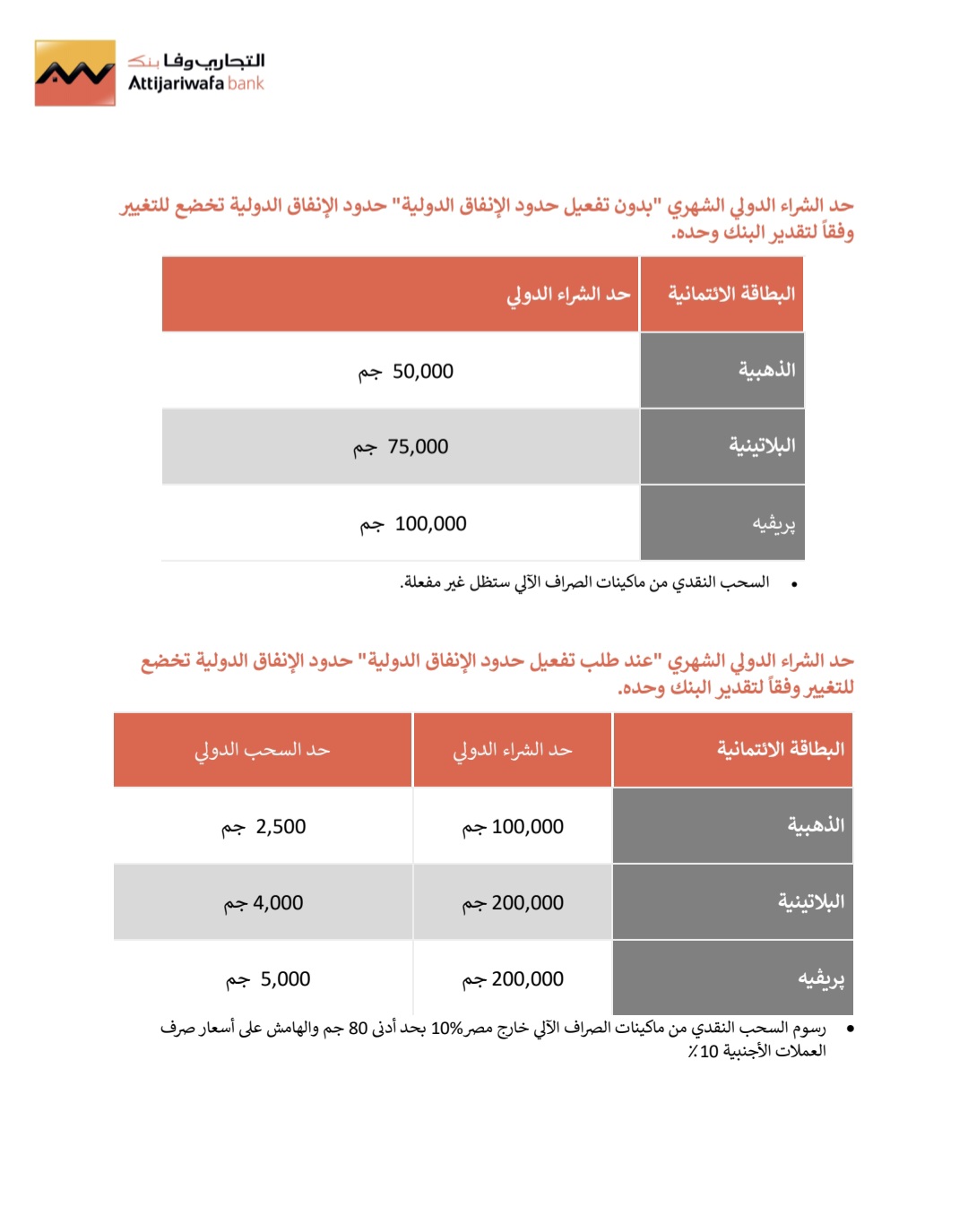 أعلن التجاري وفا بنك ايجيبت عن رفع حدود المعاملات بالبطاقات الإئتمانية خارج مصر على جميع بطاقته حتى مايعادل 200 ألف جنيه مصري وذلك للمرة الثانية منذ تحرير سعر الصرف مارس الماضي.