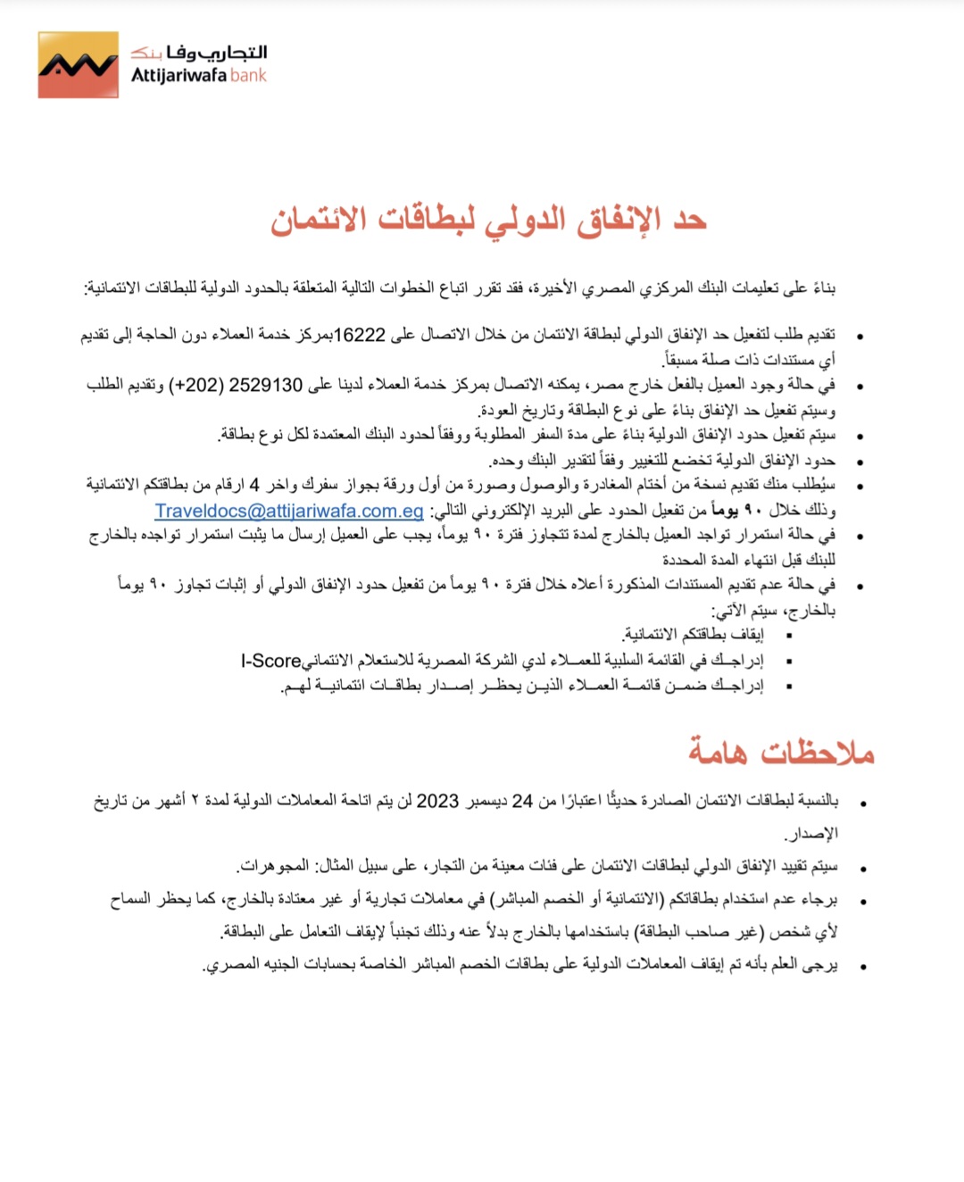 وأوضح سيطلب من العميل تقديم نسخة من أختام المغادرة والوصول وصورة من أول ورقة بجواز سفرك وآخر 4 أرقام من بطاقتكم الائتمانية وذلك خلال 90 يوما من تفعيل الحدود على البريد الإلكتروني التالي: Traveldocs@attijariwafa.com.eg في حالة استمرار تواجد العميل بالخارج لمدة تتجاوز فترة ٩٠ يوماً، يجب على العميل إرسال ما يثبت استمرار تواجده بالخارج للبنك قبل انتهاء المدة المحددة.