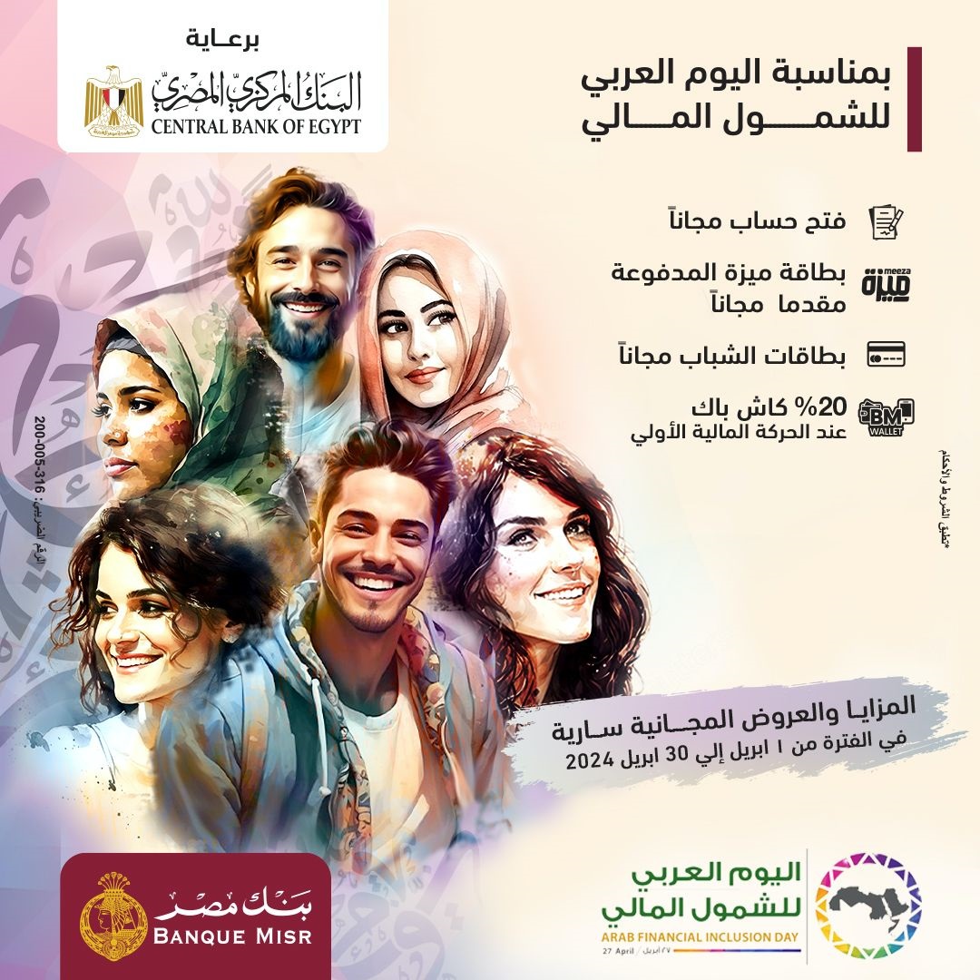 قام بنك مصر بتقديم العديد من المزايا والعروض المجانية بمناسبة “اليوم العربي للشمول المالي ” تحت رعاية البنك المركزي المصري انطلاقاً من حرصه على دعم جهود الدولة في تحقيق الشمول المالي، واتساقاً مع رؤية مصر 2030 لتحقيق التنمية المستدامة.