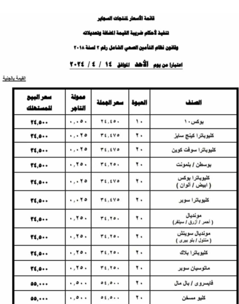 ووفقًا للائحة الأسعار التي سيتم تطبيقها اليوم فإن سعر علبة السجائر البوكس «10» بلغ 24.5 جنيهًا، بزيادة تصل إلى 2.5 جنيه، فيما سجلت الكليوباترا بأنواعها الكينج سايز، وسوفت كوين، وبوكس، وسوبر، وبلاك ليبول، وماتسيون سوبر 34.5 جنيهًا للعلبة الواحدة بزيادة تقدر بنحو 4.5 جنيه للعبوة.