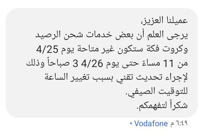 أعلنت شركة فودافون عن تعطل خدمات شحن الرصيد وكروت فكة يوم الخميس المقبل الموافق 25 ابريل الجاري وحتى الثالثة من صباح يوم الجمعة الموافق 26 ابريل الحالي.