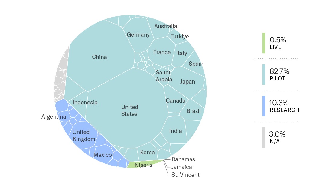 على الرغم من أن الدول ذات العملات الرقمية للبنوك المركزية العاملة لا تشكل سوى نسبة ضئيلة من الناتج المحلي الإجمالي العالمي، إلا أن التجارب التجريبية على العملات الرقمية للبنوك المركزية تجري الآن في أكثر من ثلث الدول بما يغطي حوالي 80% من الناتج المحلي الإجمالي العالمي.