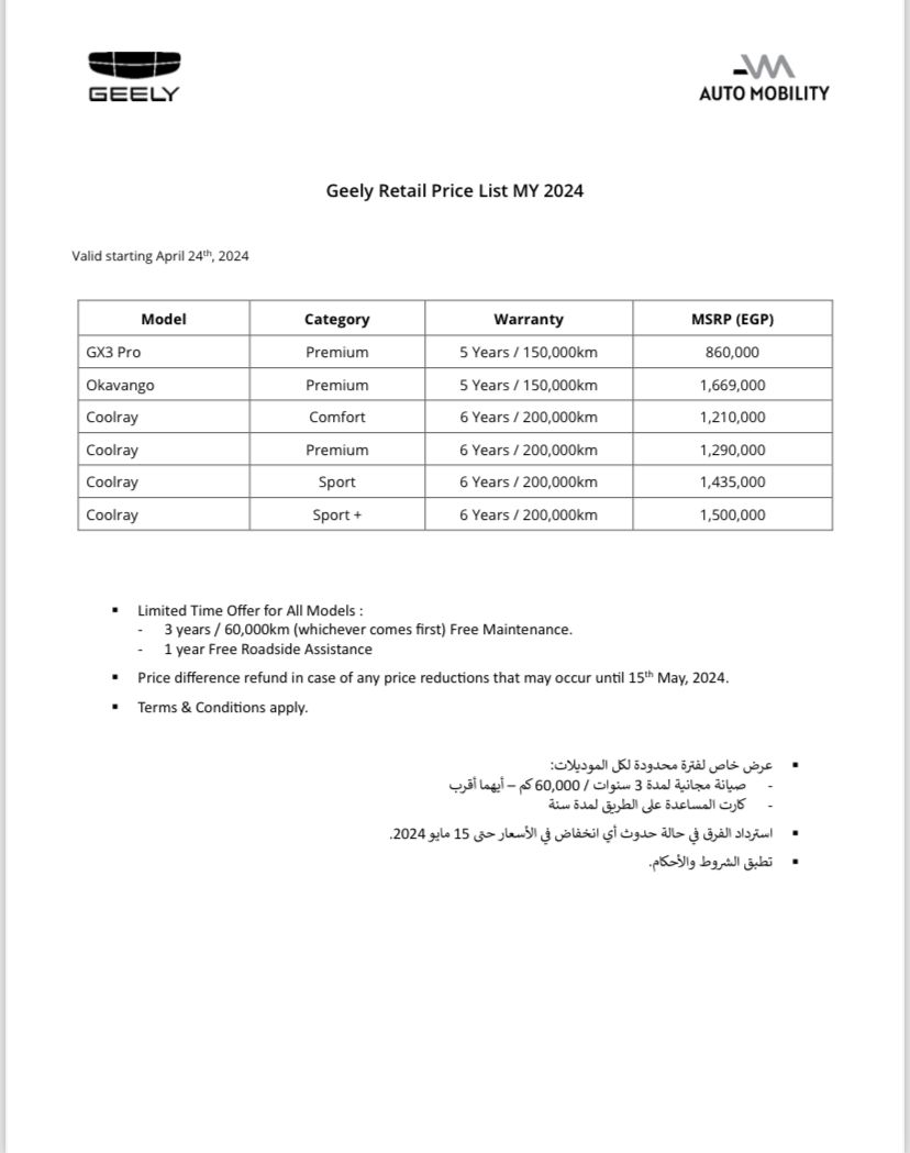 وقالت الشركة في بيان لها أنها تقدم عروضا خاصة حصرية في السوق المصري تتضمن «صيانة مجانية» لمدة 3 سنوات أو 60 ألف كيلو متر وتوفير «كارت مساعدة» على الطريق لمدة عام، فضلا عن إمكانية استراد الفرق في حالة حدوث أي انخفاض في الأسعار حتى 15 مايو 2024.