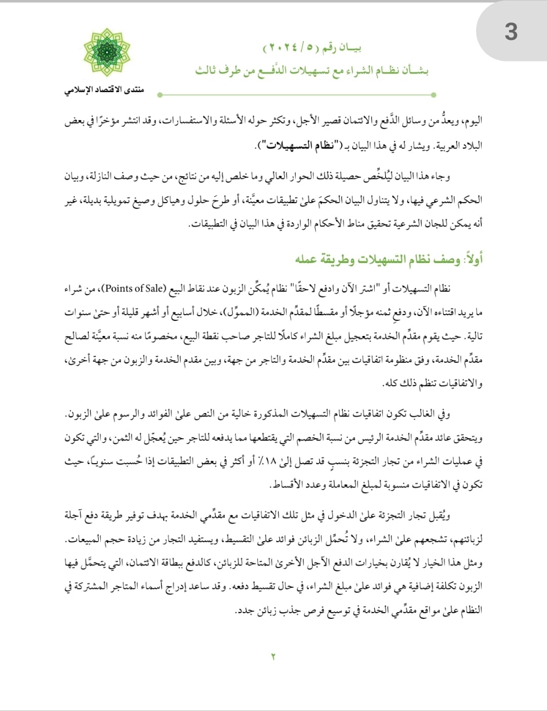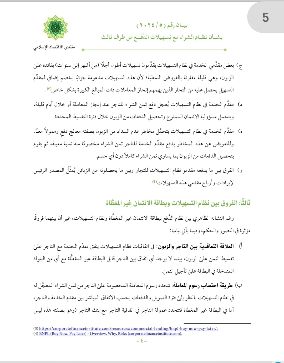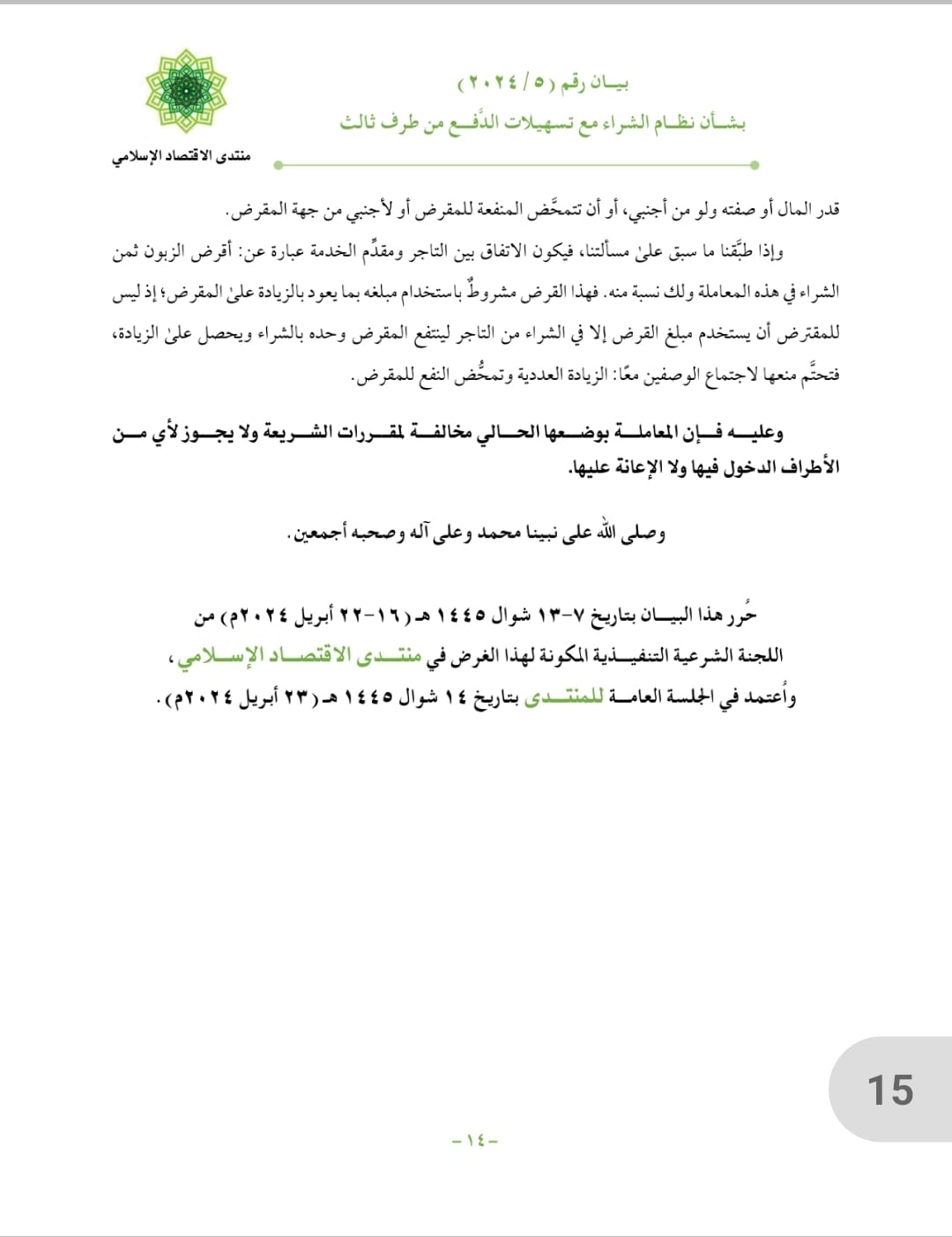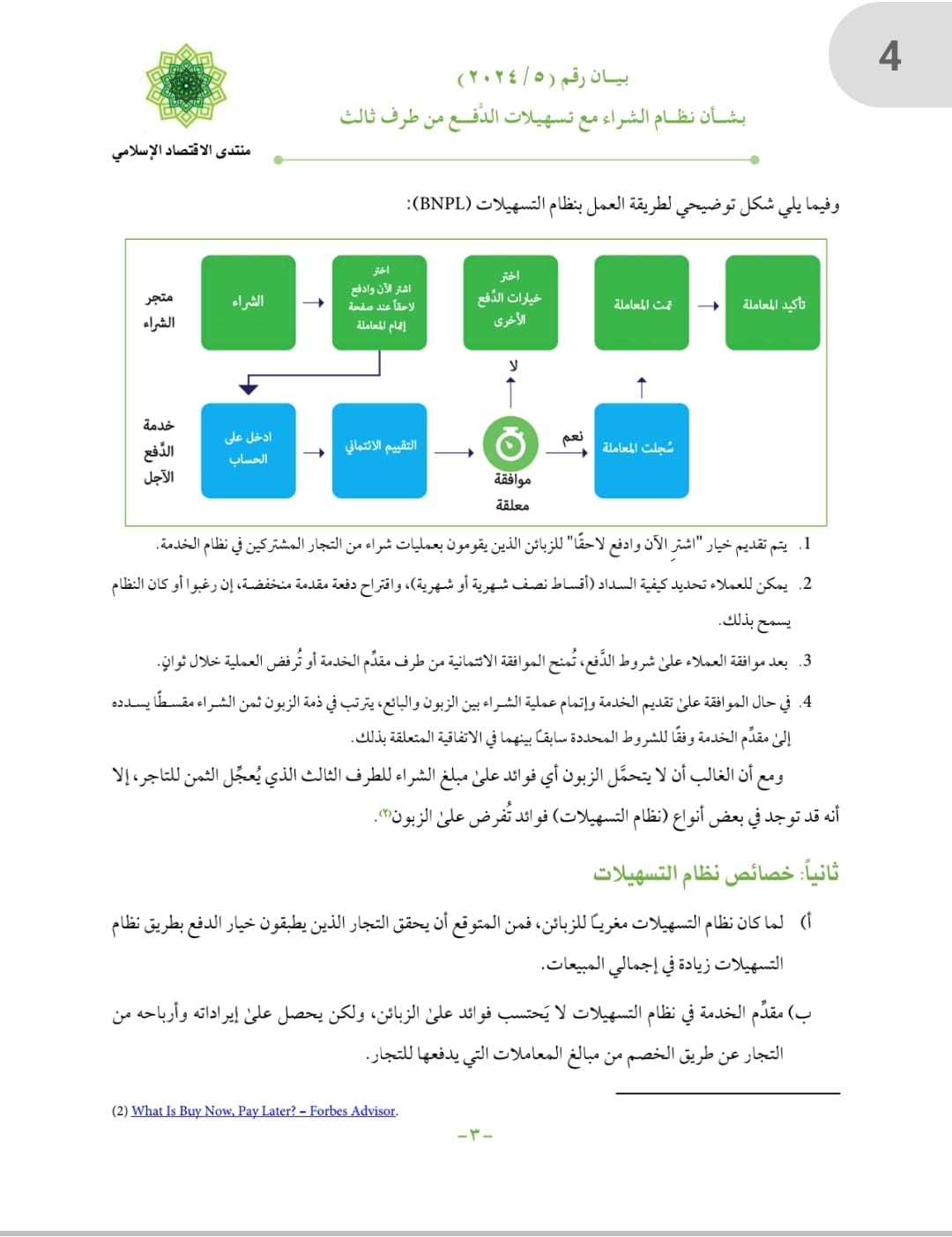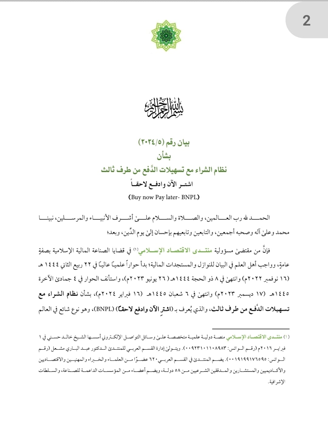 وقد أصدر المنتدى بيانا مفصلا من 16 صفحة، حصلت بوابة التكنولوجيا المالية «فنتيك جيت FinTech Gate» على نسخة منه تضمنت إصدار فتوى بمخالفة نظام الشراء مع تسهيلات الدفع من طرف ثالث والمعروفة بإسم إشتر الآن وإدفع لاحقا Buy NoW Pay Later BNLP، بنظامها الحالي للشريعة الإسلامية.
