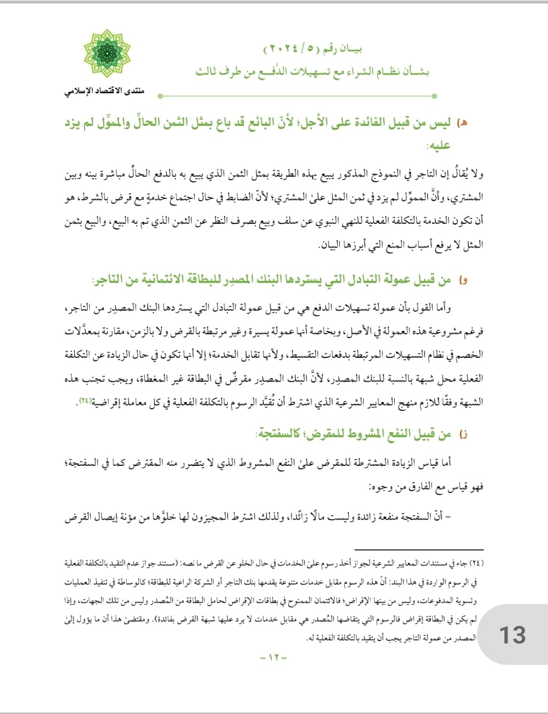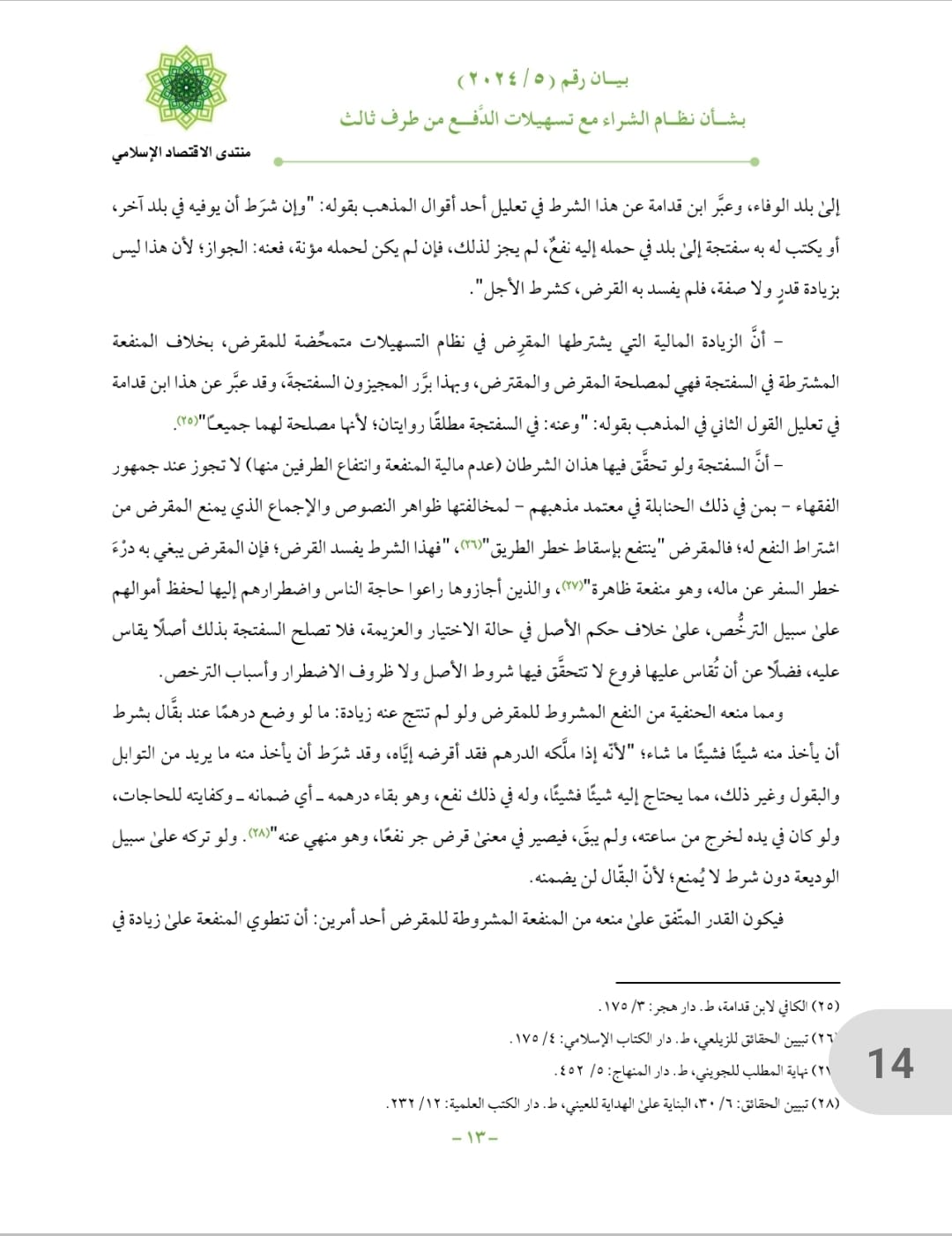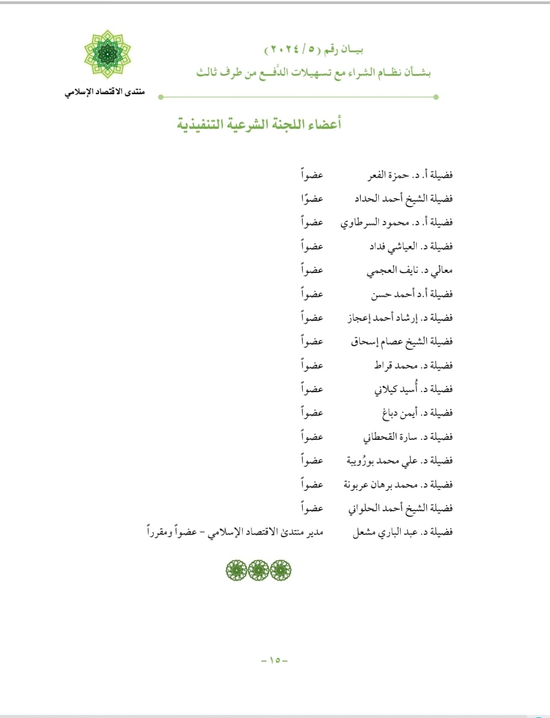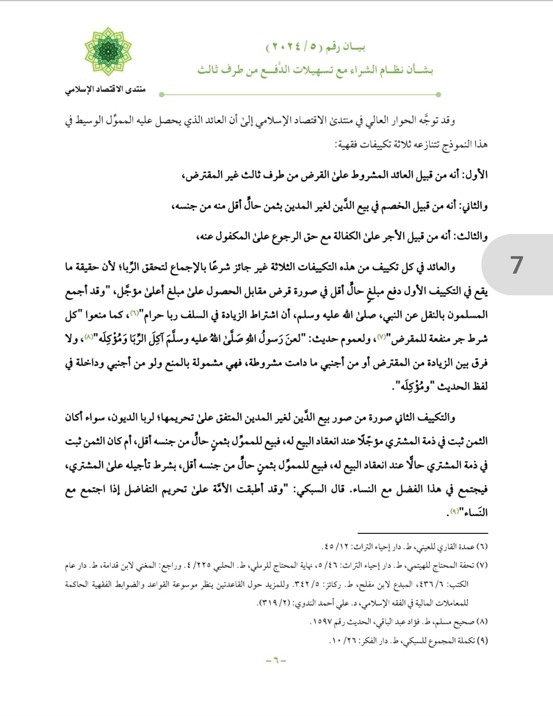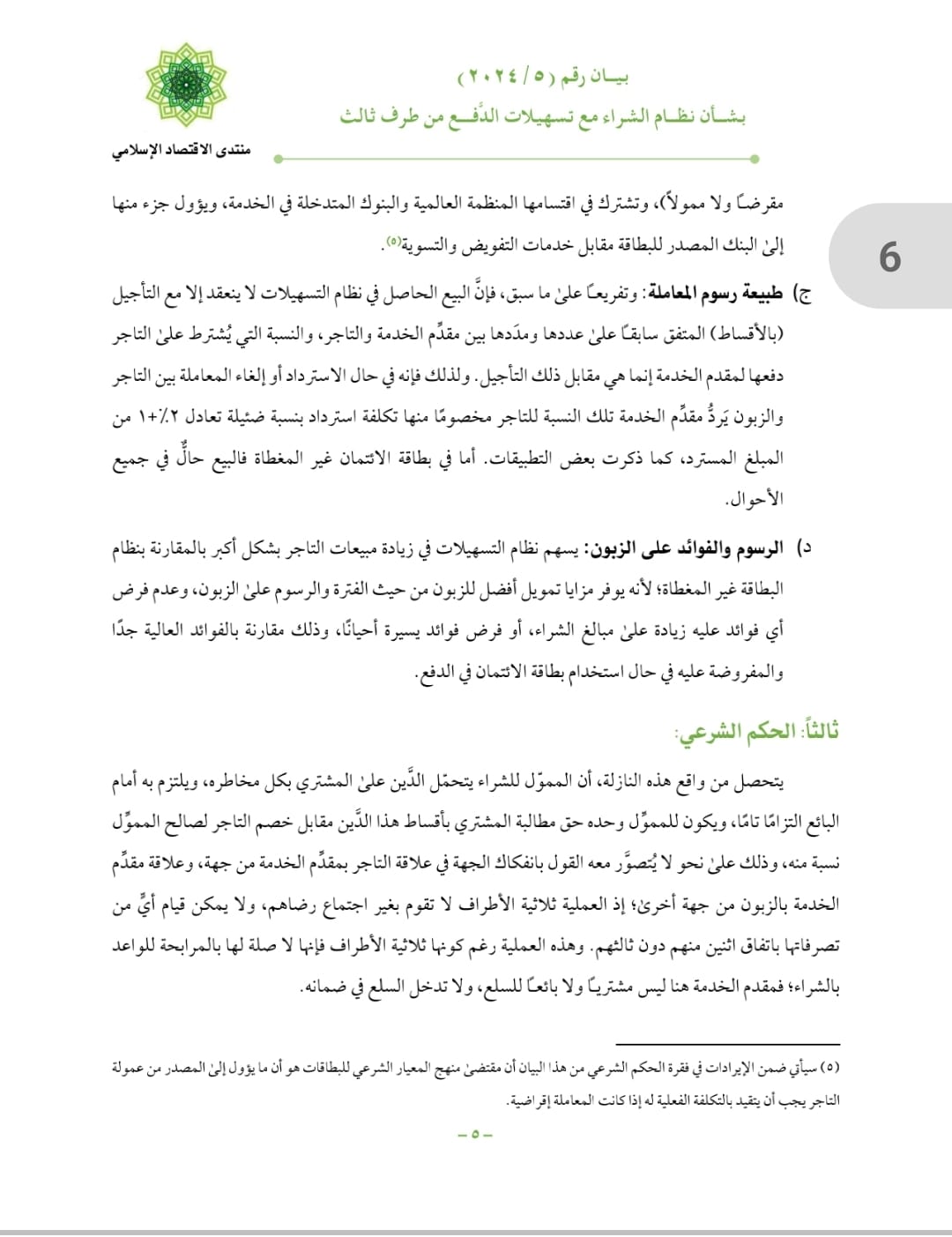 وقد أصدر المنتدى بيانا مفصلا من 16 صفحة، حصلت بوابة التكنولوجيا المالية «فنتيك جيت FinTech Gate» على نسخة منه تضمنت إصدار فتوى بمخالفة نظام الشراء مع تسهيلات الدفع من طرف ثالث والمعروفة بإسم إشتر الآن وإدفع لاحقا Buy NoW Pay Later BNLP، بنظامها الحالي للشريعة الإسلامية.