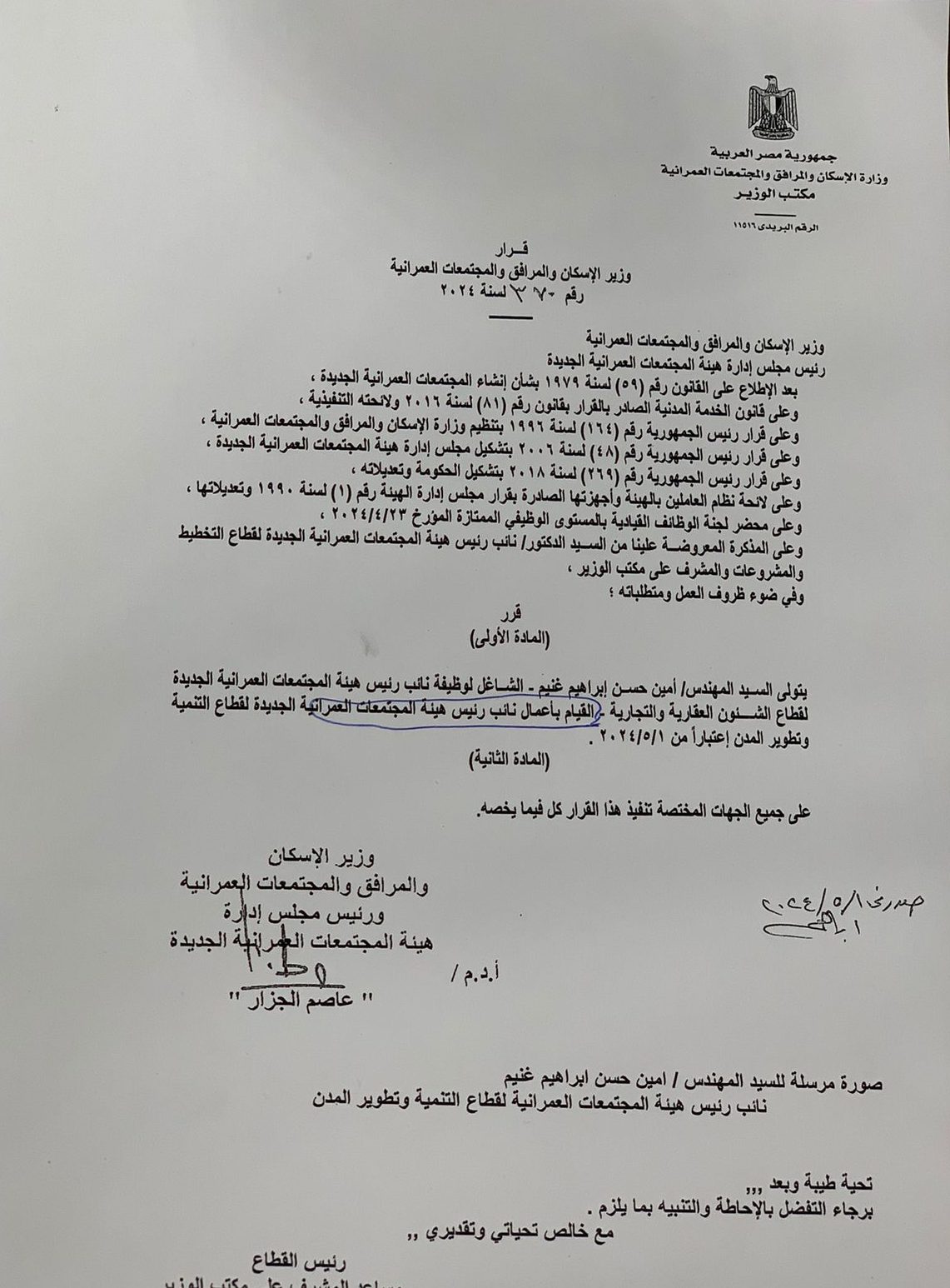 كما صدر قرار بتصعيد المهندس «أمين حسن إبراهيم غنيم» نائب رئيس هيئة المجتمعات العمرانية الجديدة لقطاع الشئون العقارية والتجارية، ليحل محل المهندس عبد المطلب عماره كنائب لرئيس هيئة المجتمعات العمرانية الجديدة لقطاع التنمية وتطوير المدن.