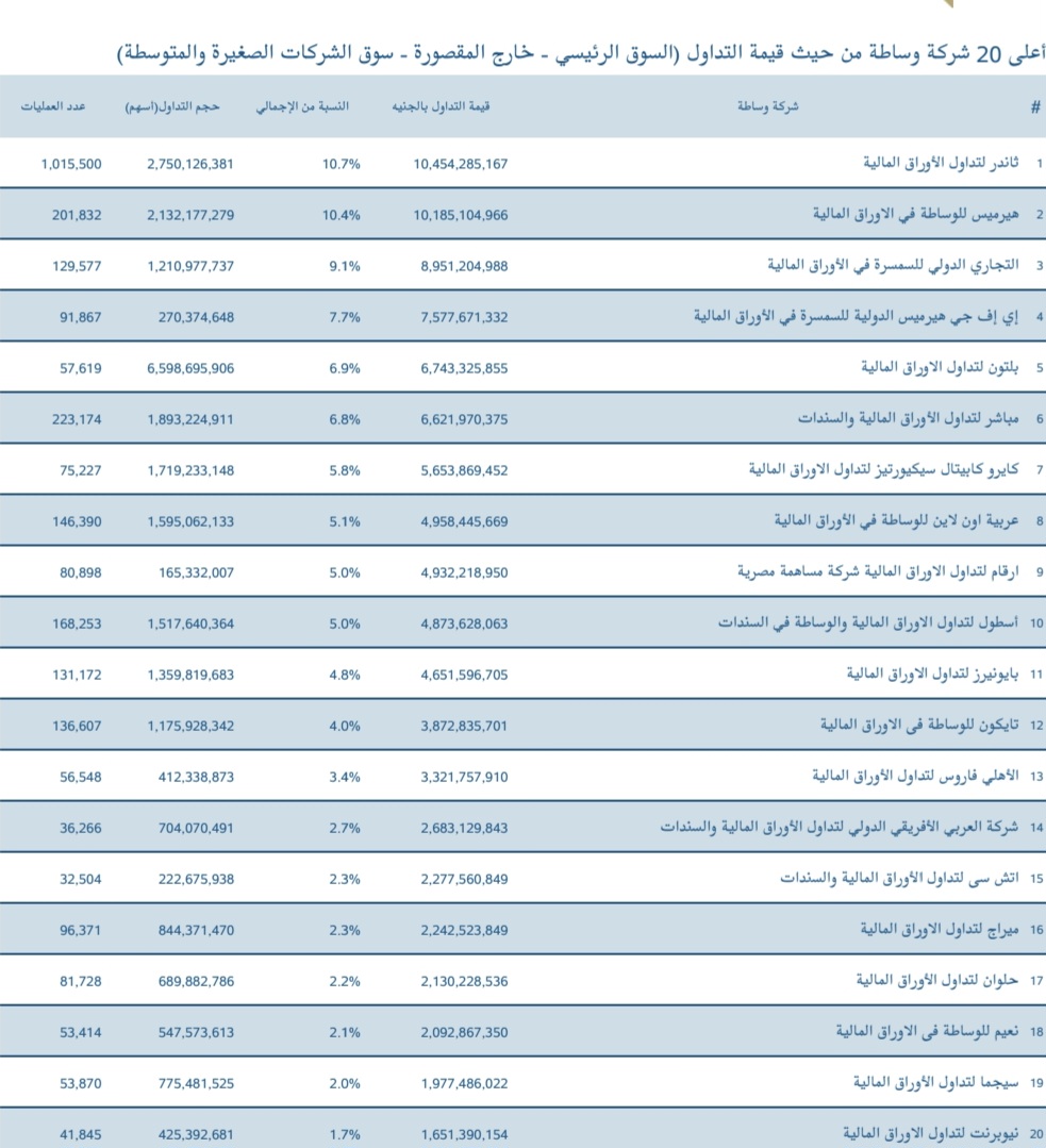 وجاءت «عربية أون لاين للوساطة في الأوراق المالية» في المرتبة الثامنة بقيمة تداولات بلغت 4.958 مليار جنيه مستحوذة على حصة سوقية بنسبة 5.1% بحجم تعاملات نحو 1.595 مليار ورقة مالية من خلال 146.390 ألف عملية، تلاها في المرتبة التاسعة “أرقام لتداول الأوراق المالية شركة مساهمة مصرية” بقيمة تداولات بلغت 4.932 مليار جنيه مستحوذة على 5 % بحجم تعاملات 165.332 مليون سهم من خلال 80.898 ألف عملية.