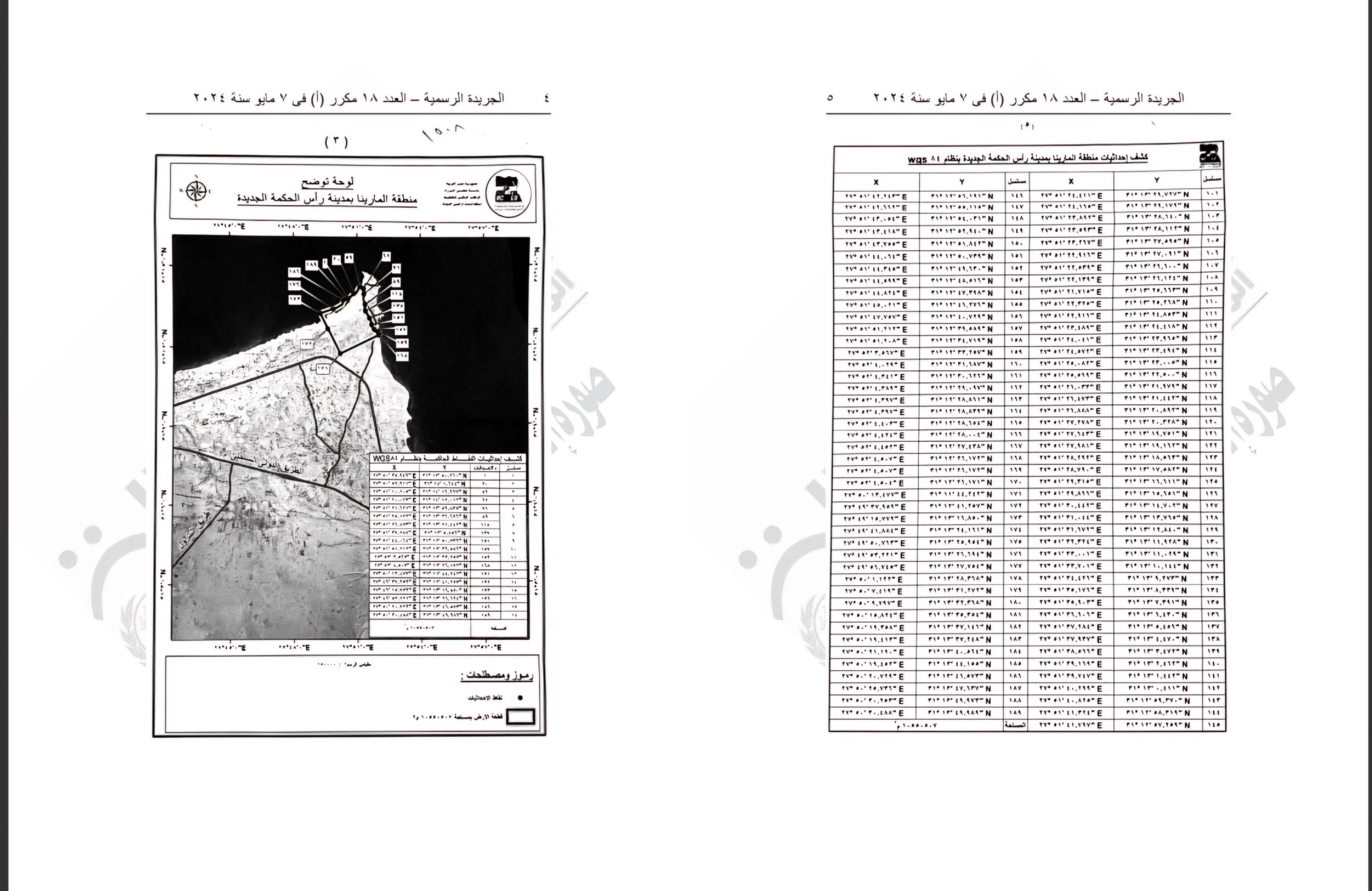 ونشرت الجريدة الرسمية قرار الدكتور مصطفى مدبولي، رئيس الوزراء بالموافقة على قيام شركة مشروع رأس الحكمة للتنمية العمرانية بإنشاء ميناء تخصصي دولي سياحي في مدينة رأس الحكمة الجديدة.