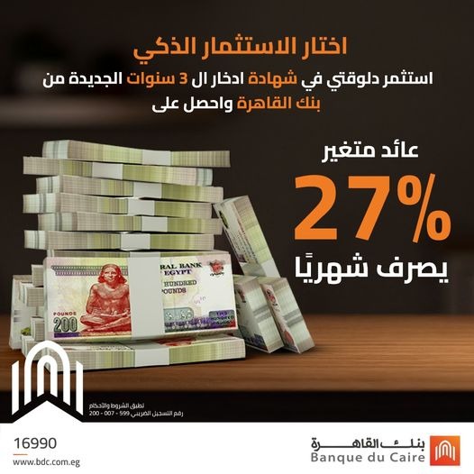 أطلق بنك القاهرة، شهادة “البريمو” الجديدة، ذات العائد المتغير (شهرى) لمدة 3 سنوات، والتي تُتيح للعملاء فرصة استثنائية لتحقيق عائدات مُجزية تصل إلى 27% سنويًا، يتم صرفها شهريًا.