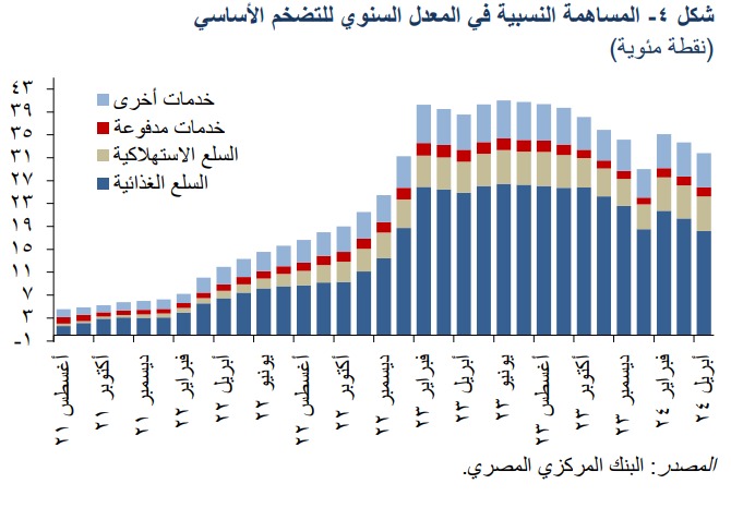 وأشار المركزي إلى أن المعدل السنوي للتضخم الأساسي شهد تباطؤا في أبريل 2024 ليسجل 31.8% مقارنة بمعدل بلغ 33.7%في مارس 2024، وهو ما يعكس انخفاض مساهمة السلع الغذائية الأساسية في التضخم الأساسي.
