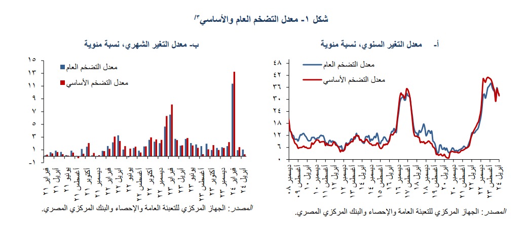 ويشير تراجع وتيرة الزيادة الشهرية في معدلات التضخم خلال شهري مارس وأبريل 2024 مقارنة بشهر فبراير 2024 (11.4%) إلى عودة تطورات التضخم إلى معدلاتها المعتادة.