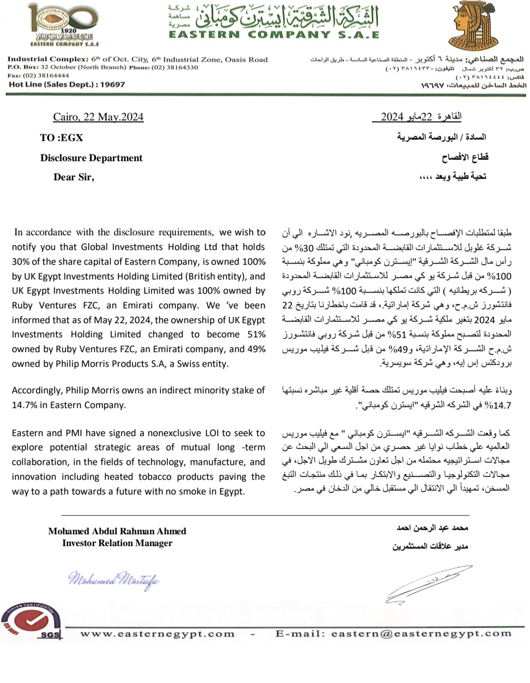 مايو 2024 بتغير ملكية شركة «يو كي مصر للاستثمارات القابضة المحدودة» لتصبح مملوكة بنسبة 51% من قبل شركة «روبي فانتشورز» الإماراتية، و 49% من قبل شركة فيليب موريس برودكتس إس إيه، وهي شركة سويسرية، وبناء عليه أصبحت فيليب موريس تمتلك حصة أقلية غير مباشره نسبتها. %14.7 في الشركه الشرقيه “ايسترن كومباني”.