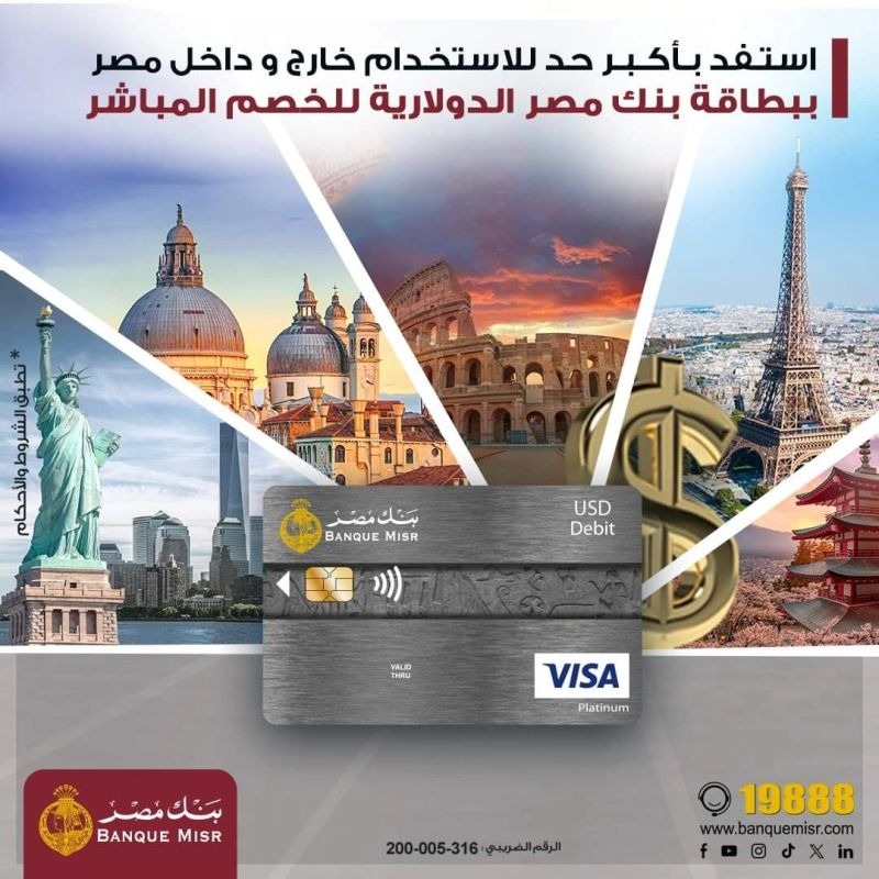 يُقدم بنك مصر لعملائه بطاقة Visa الدولارية للخصم المباشر، والتي تُتيح لهم الاستفادة من أقصى حد للاستخدام سواء داخل مصر أو خارجها.
