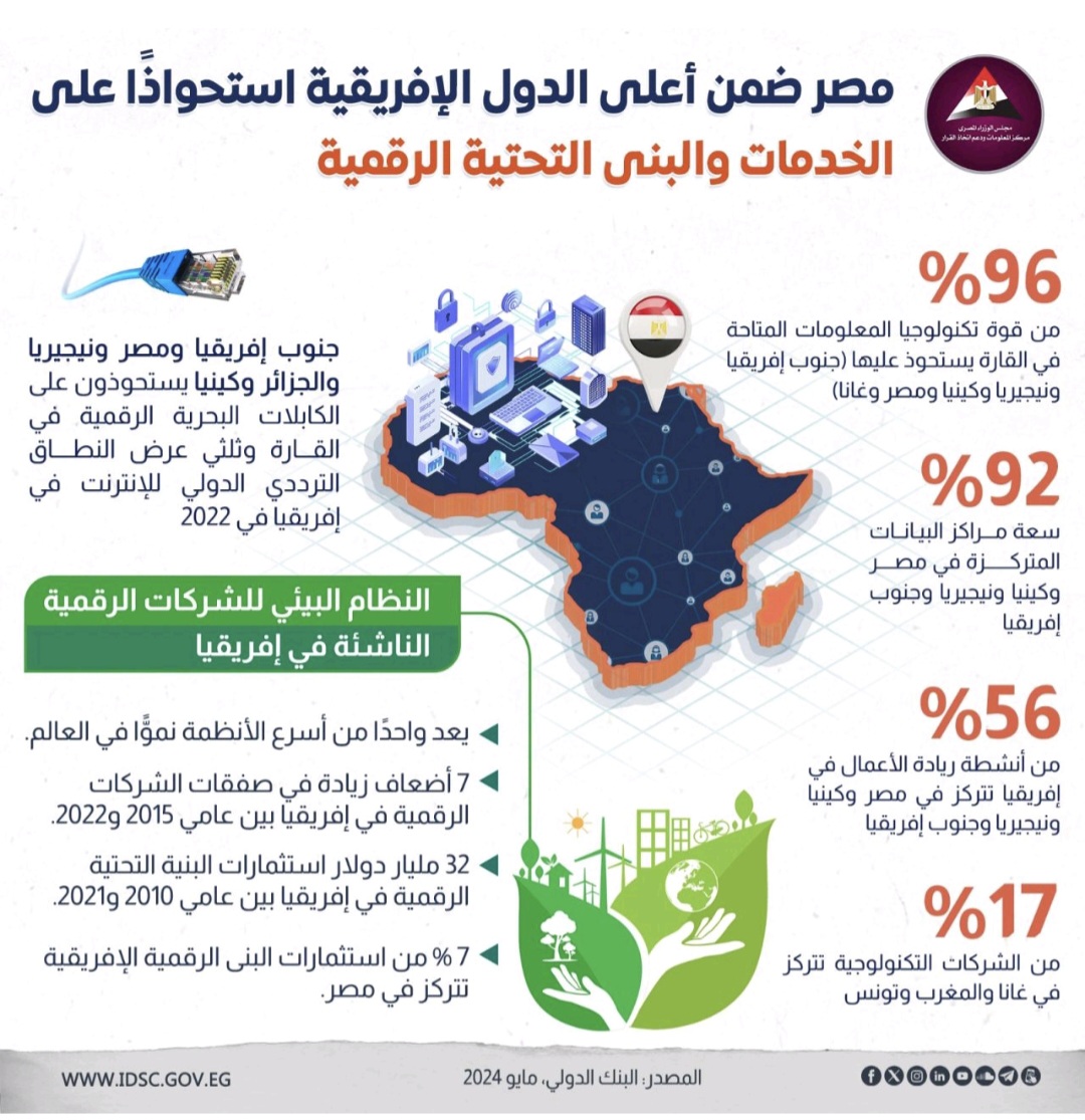 نشر مركز المعلومات ودعم اتخاذ القرار بمجلس الوزراء انفوجراف عبر صفحته الرسمية على موقع”فيسبوك” أن مصر ضمن أعلى الدول الإفريقية استحواذًا على الخدمات والبنى التحتية الرقمية، وفقًا للبنك الدولي.