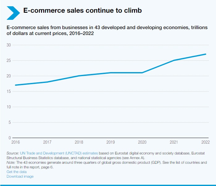 وأشارت في تقرير حديث إلى أن مبيعات التجارة الإلكترونية في 43 دولة نامية ومتقدمة تمثل حوالي ثلاثة أرباع من الناتج المحلي الإجمالي العالمي قد وصلت إلى ما يقرب من 27 تريليون دولار أمريكي بحلول عام 2022، بزيادة قدرها 60% عن عام 2016.