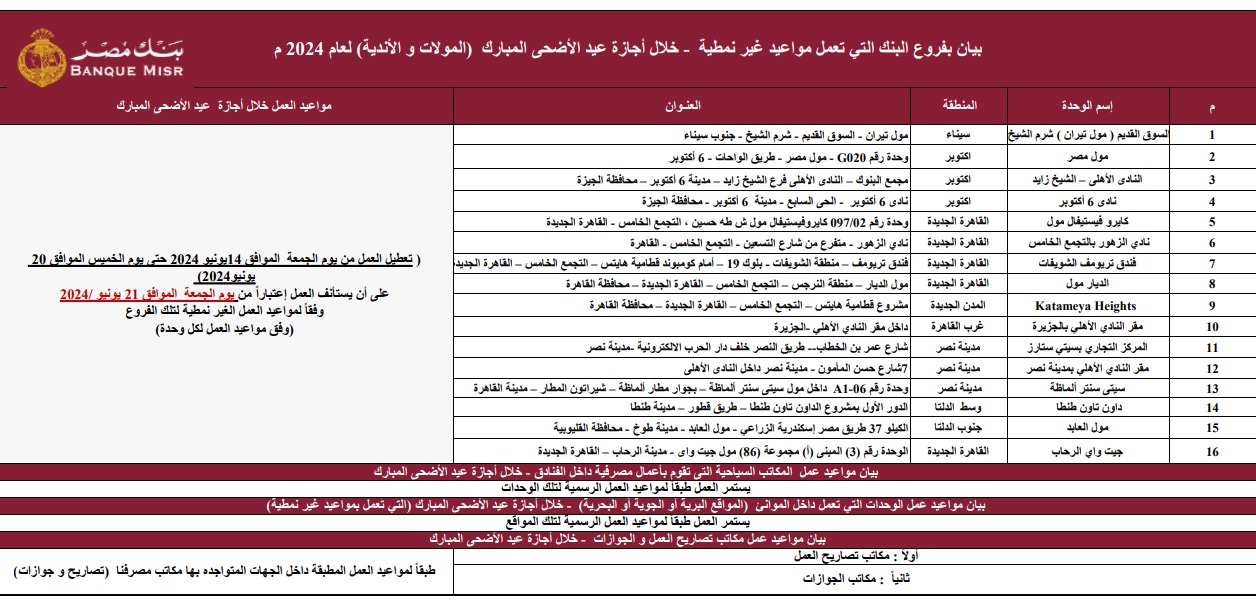 أعلن بنك مصر عن تخصيص أكثر من 16 فرعًا للعمل خلال أيام العيد، وذلك لضمان استمرارية تقديم خدماته المصرفية المتنوعة للعملاء حرصًا على راحة عملائه وتلبية احتياجاتهم خلال عطلة عيد الأضحى المبارك.