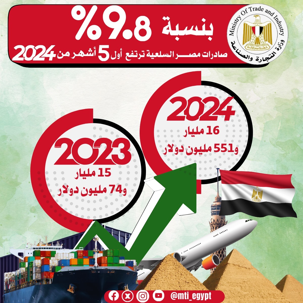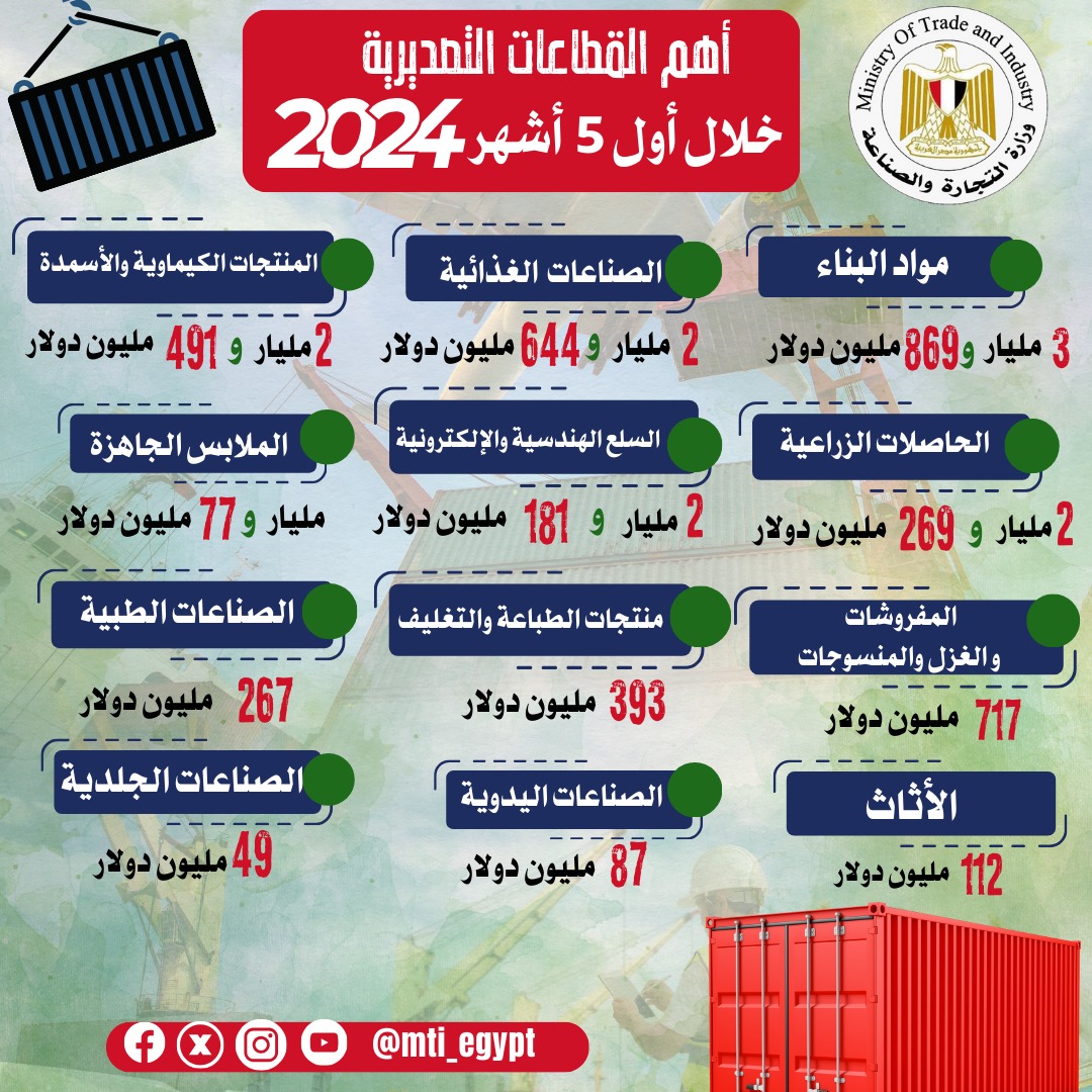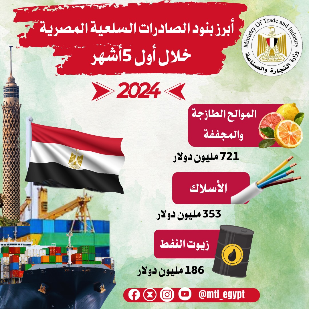 جاء ذلك في سياق أحدث تقرير تلقاه الوزير من الهيئة العامة للرقابة على الصادرات والواردات حول مؤشرات الصادرات السلعية المصرية خلال الـ5 أشهر الأولى من العام الجاري.