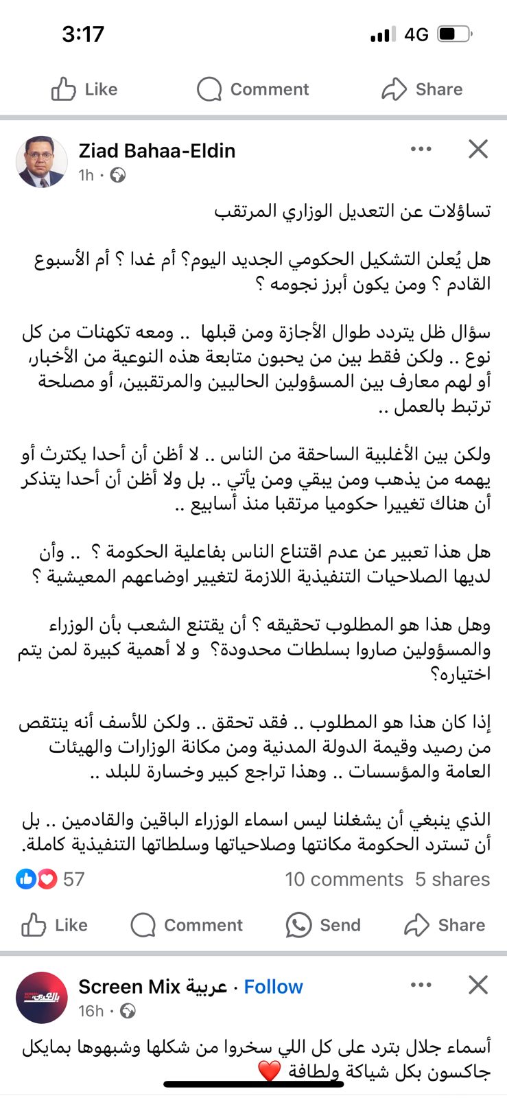 طرح الدكتور زيادة بهاء الدين نائب رئيس الوزراء المصري الأسبق عدة تساؤلات على صفحته على موقع التواصل الإجتماعي الفبسبوك حول التعديل الوزاري المرتقب في مصر.