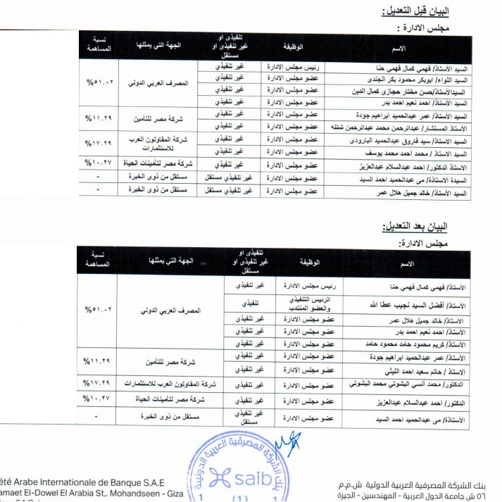 قال بنك الشركة المصرفية العربية الدولية saib، إن إنضمام الدكتور محمد أنسي البشوتي محمد البشوتي لعضوية مجلس إدارة البنك مرهونا باستصدار قرار الدكتور رئيس مجلس الوزراء للجمع بين عملة كعضو مجلس إدارة تنفيذي بشركة المقاولون العرب عثمان أحمد عثمان وعضويته بمجلس إدارة البنك التزاما بما تقضي به أحكام المادة (177) من قانون الشركات المساهمة رقم 159 لسنة 1981.