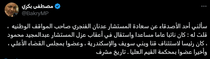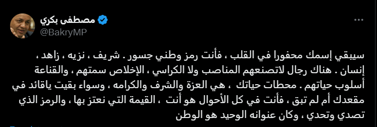من جانب أخر..كتب الإعلامي مصطفى بكري تدوينه غامضة على موقع إكس يودع فيها شخصا ما وجاء نص رسالته كالتالي: