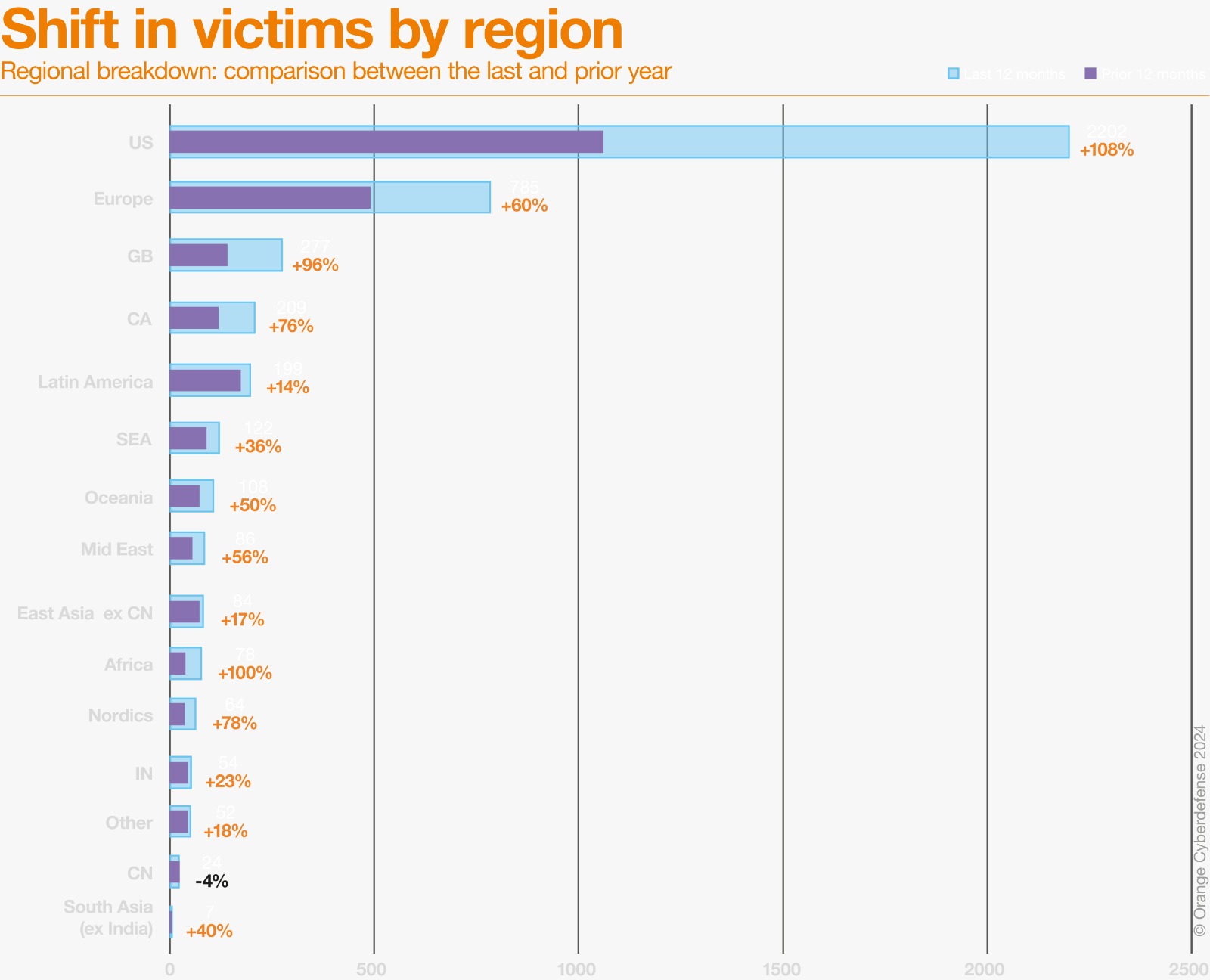 إلى جانب كونها المنطقة الأكثر تضررا، شهدت الولايات المتحدة أيضًا أسرع نمو بنسبة 108% ، تليها بريطانيا العظمى وكندا بنسبة 96% و 76% على التوالي.