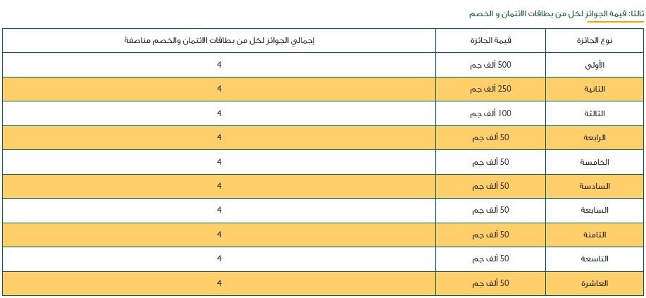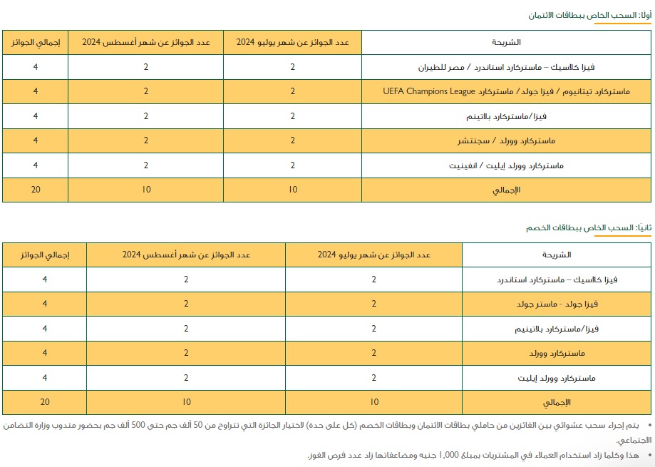 • إجمالي الجوائز الشهرية: 20 فائزًا شهريًا (10 بطاقات ائتمان و10 بطاقات خصم)، مع وجود فائزين احتياطيين في حال عدم الوصول إلى الفائزين الأساسيين.
