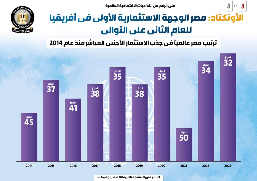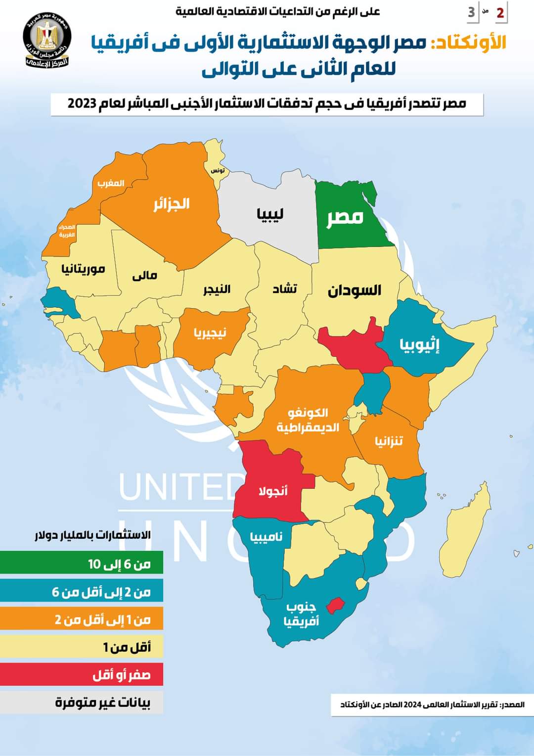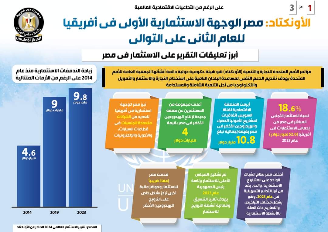 و نشر المركز الإعلامي لمجلس الوزراء تقريراً تضمن إنفوجرافات تسلط الضوء على ما أورده تقرير الاونكتاد، بأن مصر الوجهة الاستثمارية الأولى في أفريقيا للعام الثاني على التوالي على الرغم من التداعيات الاقتصادية العالمية.