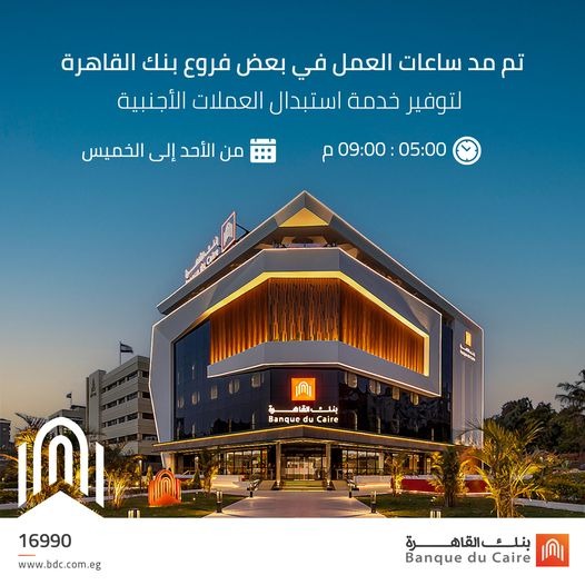 أعلن بنك القاهرة عن تمديد ساعات العمل في عدد من فروعه لتوفير خدمة استبدال العملات الأجنبية من الساعة 5 مساءً حتى 9 مساءً من الأحد إلى الخميس.