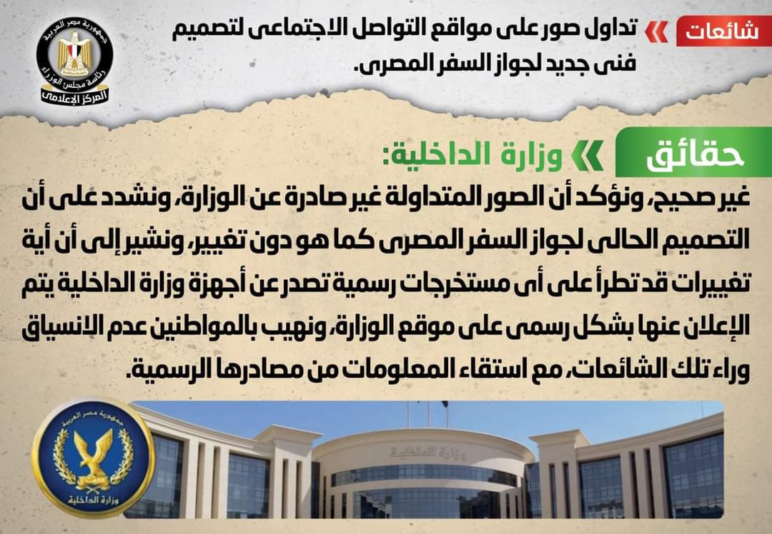وشددت على أن التصميم الحالي لجواز السفر المصري كما هو دون تغيير، مُشيرةً إلى أن أية تغييرات قد تطرأ على أي مستخرجات رسمية تصدر عن أجهزة وزارة الداخلية يتم الإعلان عنها بشكل رسمي على موقع الوزارة، مُهيبةً بالمواطنين عدم الانسياق وراء تلك الشائعات، مع استقاء المعلومات من مصادرها الرسمية.