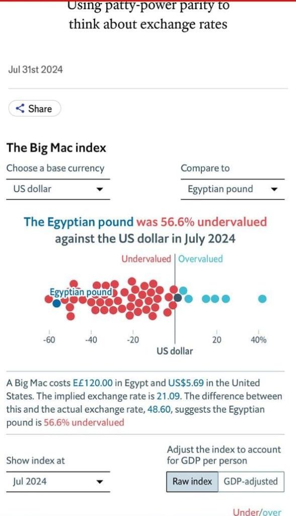 وفقاً للمؤشر الذي يقيس قوة العملات حول العالم بناءً على سعر وجبة البيج ماك الشهيرة، تبين أن سعر الوجبة في مصر يبلغ 120 جنيهاً مصرياً، بينما يبلغ سعرها في الولايات المتحدة 5.69 دولاراً أمريكياً. وبناءً على هذا الفارق، فإن القيمة العادلة للجنيه المصري مقابل الدولار الأمريكي يجب أن تكون حوالي 21.09 جنيه، وهو أقل بكثير من السعر الرسمي الحالي مايعنى أن الجنيه المصري مقوم بأقل من قيمته الحقيقية أمام الدولار الأمريكي بـ56.6%.